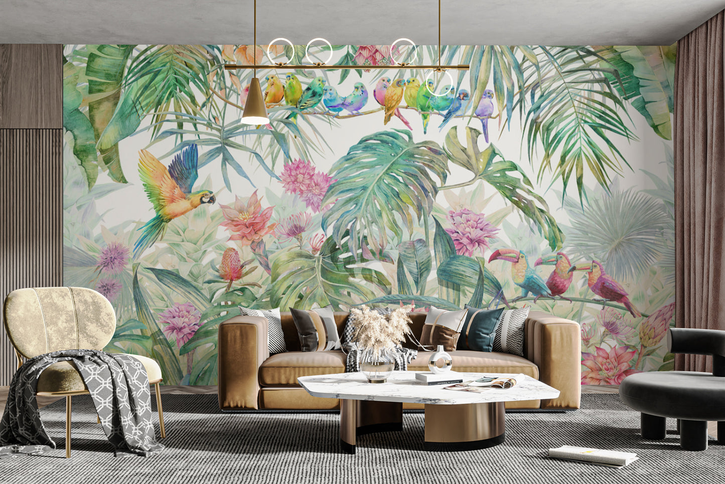 Experience the serene beauty of nature with our tropical forest bird mural wallpaper. Dive deep into the lush greens and vibrant hues of this tropical wallpaper, capturing the essence of the wilderness and bringing it straight to your living room. Every detail is intricately designed, from the delicate flight of the birds to the majestic trees, making it the perfect living room for nature enthusiasts. The distinct bird illustrations add a touch of whimsy, ensuring that this bird wallpaper not only enhances your home decor but also evokes feelings of tranquillity and wonder.