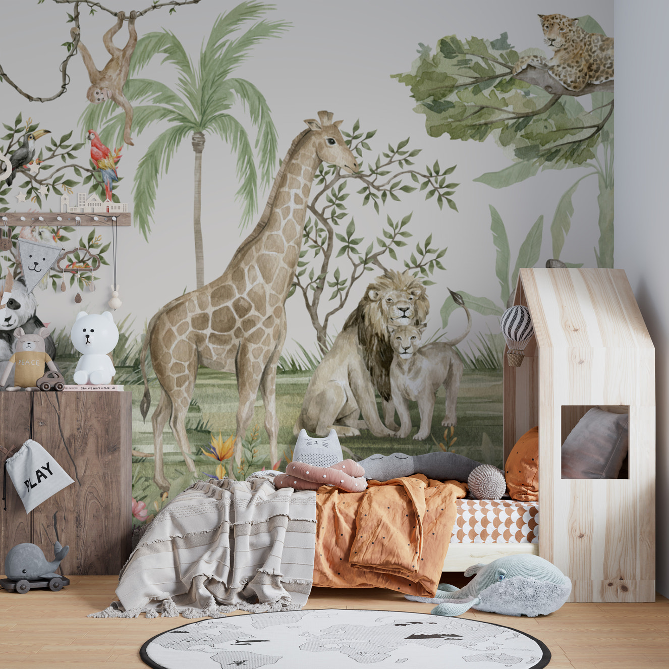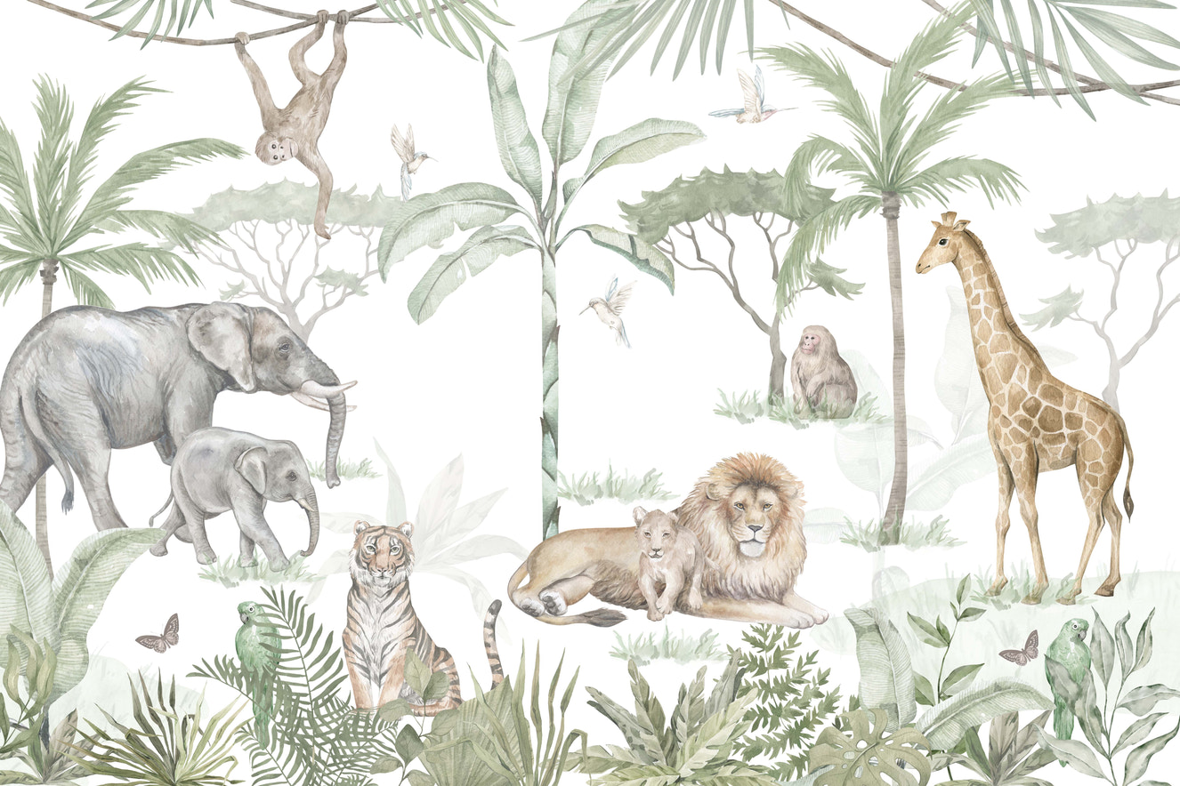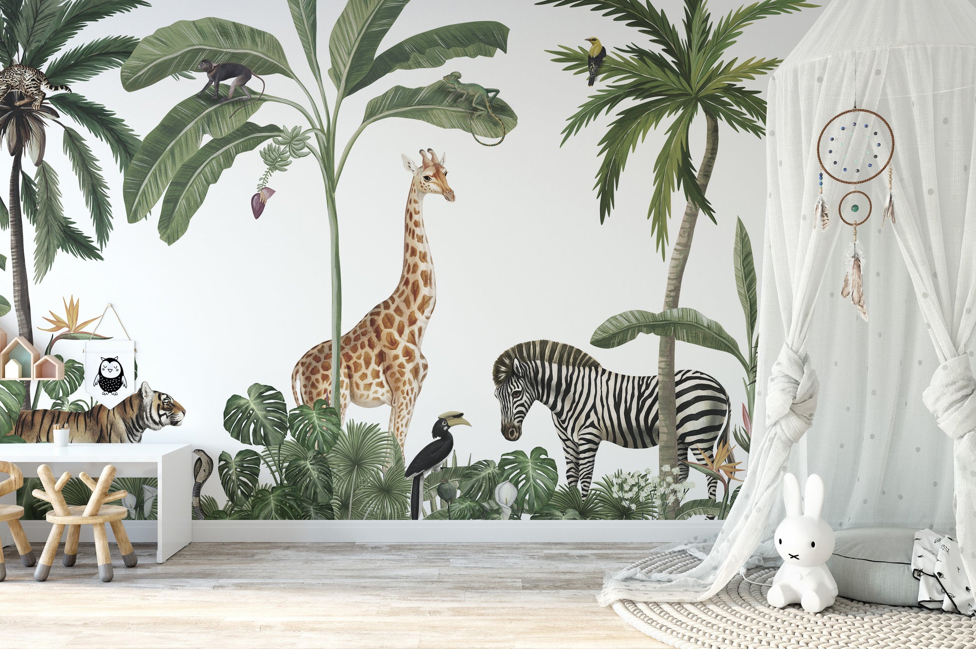 Journey into the heart of the wilderness with our Tropical Forest Wild Animals & Trees Wallpaper. This lush mural captures the vibrant essence of the tropical forest, teeming with wild animals and dense foliage. Each glance reveals new details and secrets of the forest, inviting exploration and wonder. Perfect for those seeking to bring the mystery and beauty of the tropics into their space, this tropical wallpaper offers a rich, immersive experience. Transform your room into a jungle oasis, where adventure and nature's majesty surround you.