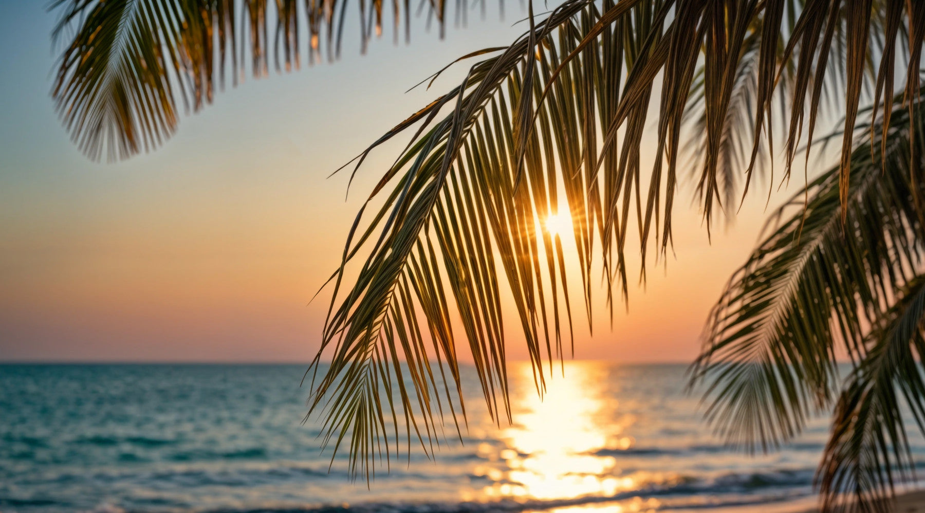 Bring the warmth of the tropics into your space with this captivating wallpaper for walls. The design features lush palm leaves silhouetted against a vibrant sunset sky. Sunlight streams through the fronds, casting a golden glow that reflects on the serene ocean. Soft hues of turquoise, orange, and pink create a calming and inviting atmosphere. Ideal for living rooms, bedrooms, or even bathrooms, this wallpaper enhances interiors with a touch of exotic tranquility. It creates a focal point that evokes a sense of relaxation and escape.