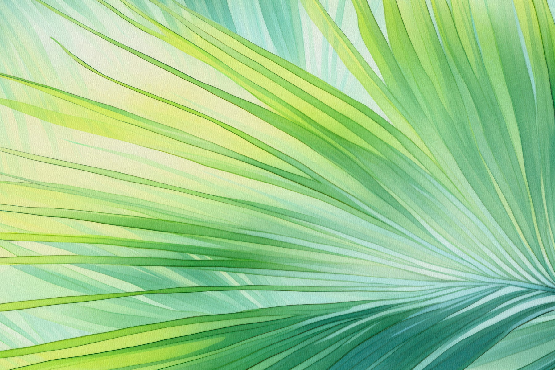 Immerse yourself in the lush beauty of the tropics with this vibrant wallpaper. The artistic rendering of palm leaves uses a watercolor technique to capture the subtle variations in shades of green, from bright lime to deep teal. The radiating lines of the leaves create a sense of movement and energy, while the overall color palette evokes feelings of tranquility and peace. The texture is soft and inviting, adding depth and visual interest. This wallpaper is perfect for creating a calming atmosphere in any room, from bedrooms to living spaces, adding a touch of exotic beauty to your home.