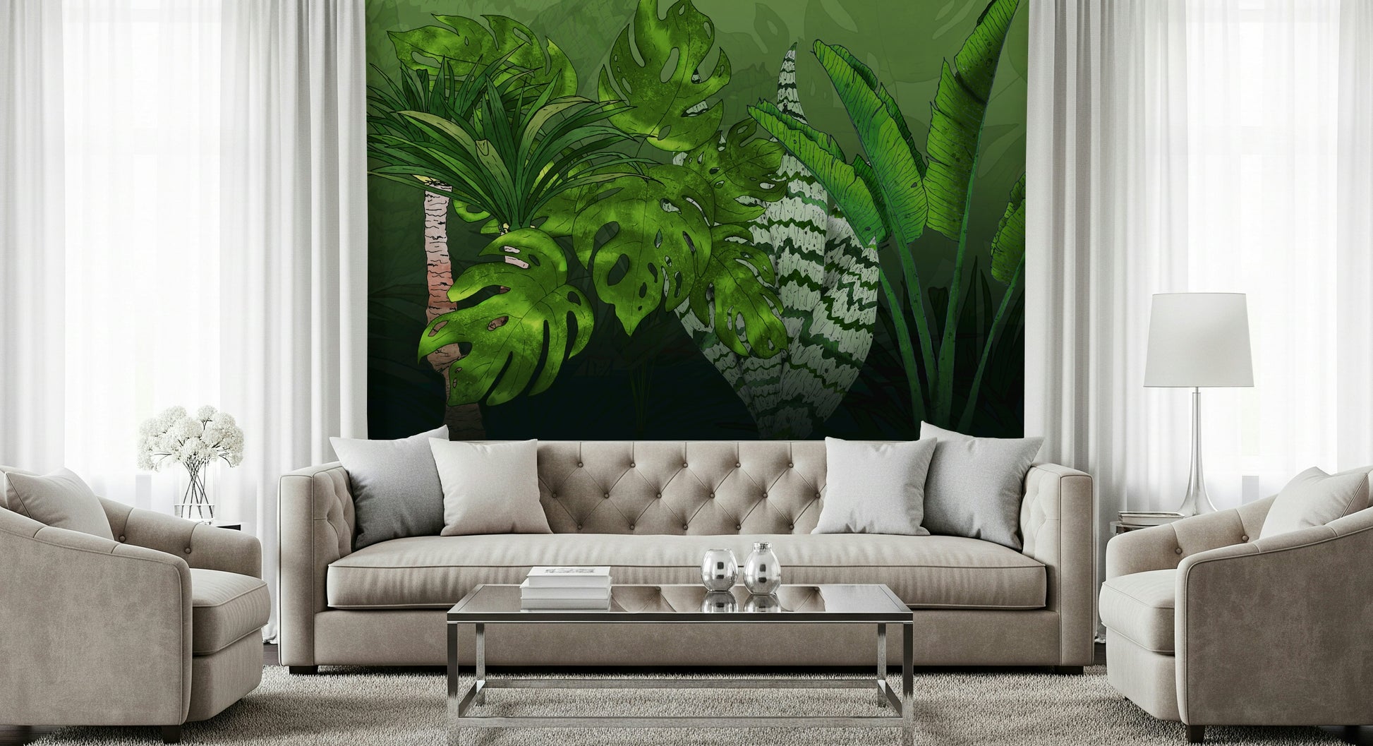 Transform any room into a tropical paradise with this inviting wallpaper for walls. The design bursts with various exotic foliage, highlighted in shades of green and soft browns. It creates a vibrant, immersive experience. This pattern is perfect for adding a touch of nature to a living room, bedroom, or even an office. The detailed and colourful illustration style beautifully enhances interiors. Imagine your space blooming with tropical charm and botanical beauty.