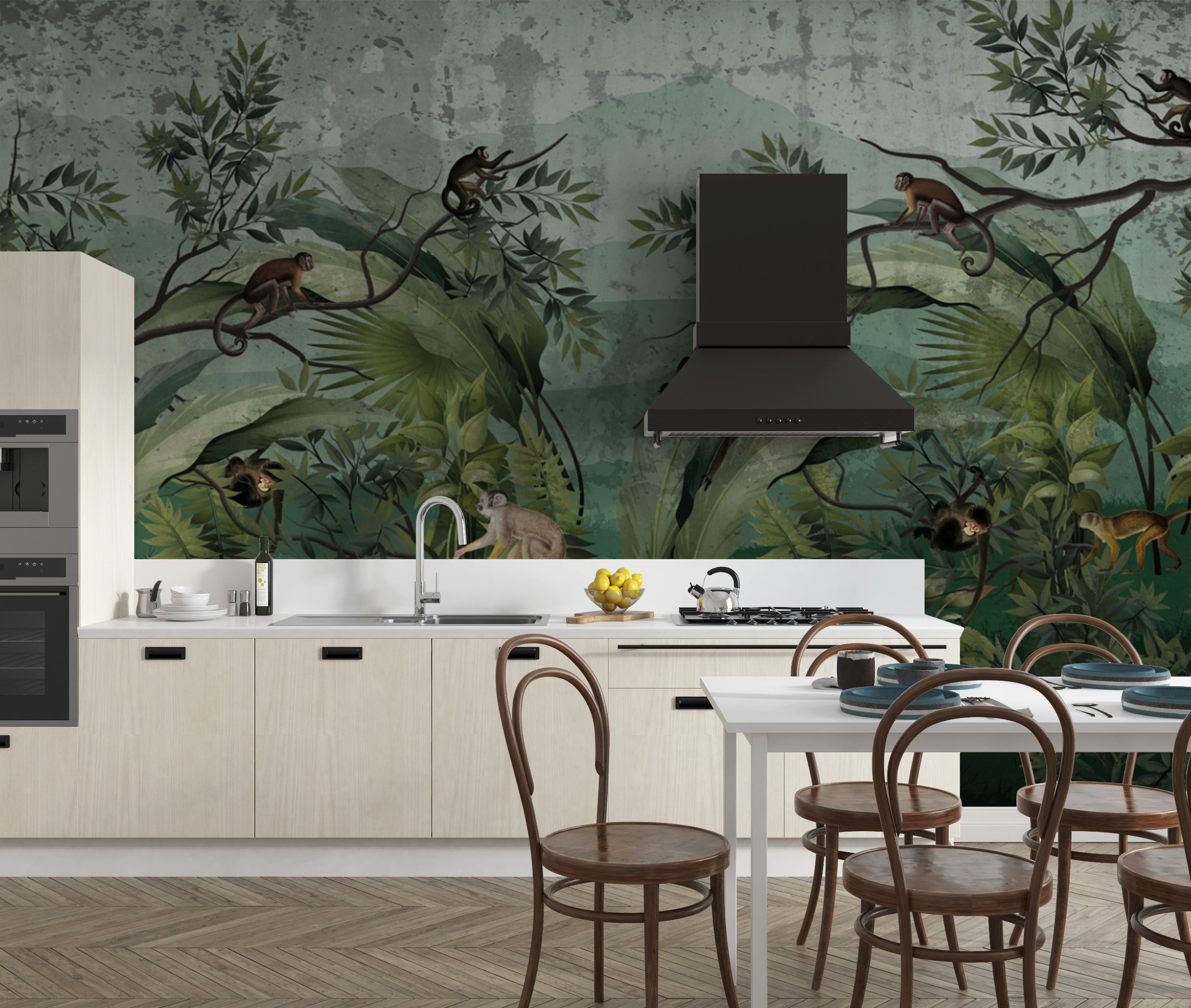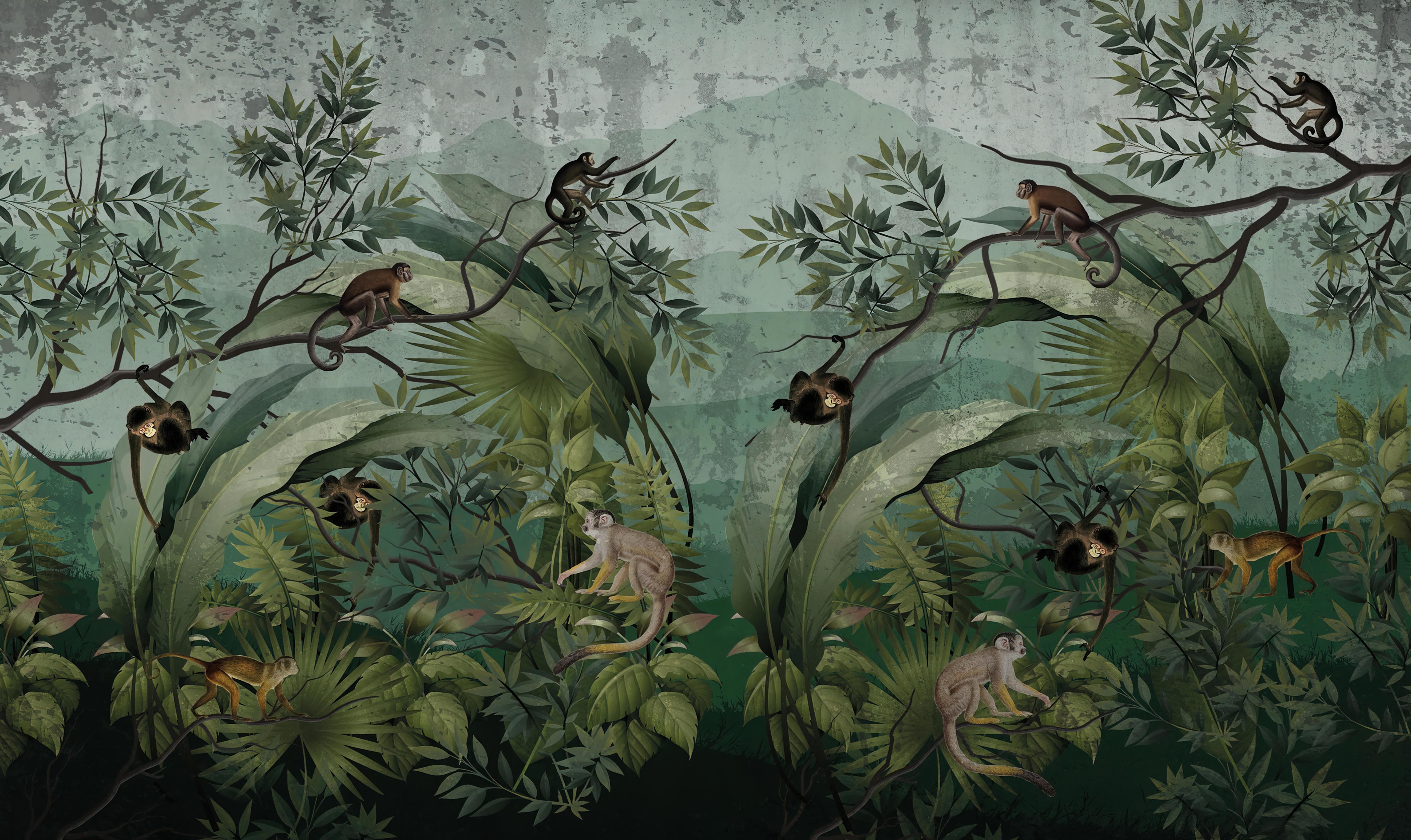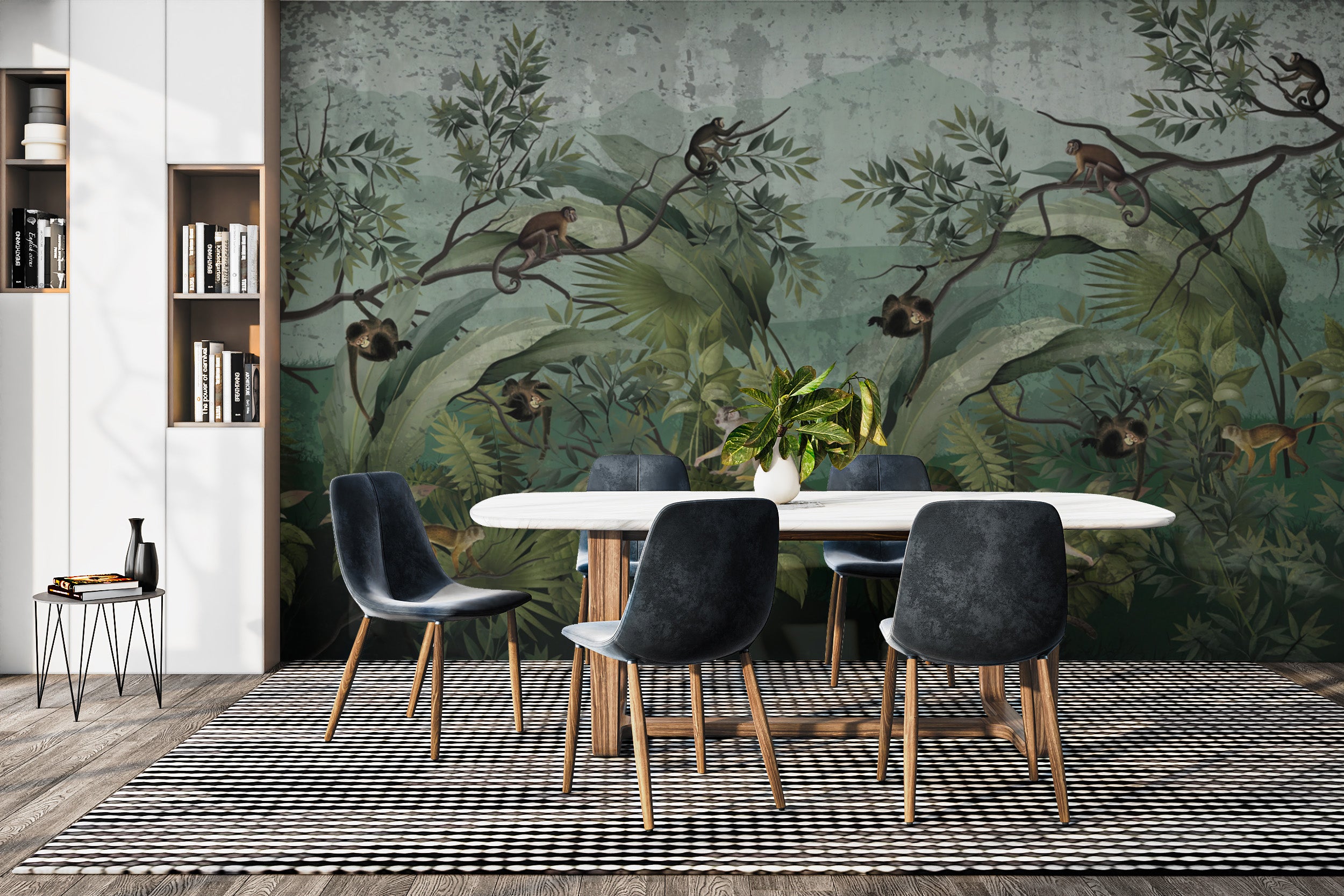 Transform your space in style with the tropical monkey jungle wall mural, a stunning combination of jungle wallpaper mural and vintage rainforest wall art. Featuring playful monkeys swinging through dense tropical foliage, this lush rainforest mural wallpaper creates a lively and exotic ambiance. Featuring hand-painted details and deep green hues, add a hint of nature to your interiors. The monkey theme is perfect for your nursery, living room, or office, bringing the wilderness right into the home. Turn your walls into rainforest wallpaper and transform them into a serene adventure for your home! Easy to put up and take down!