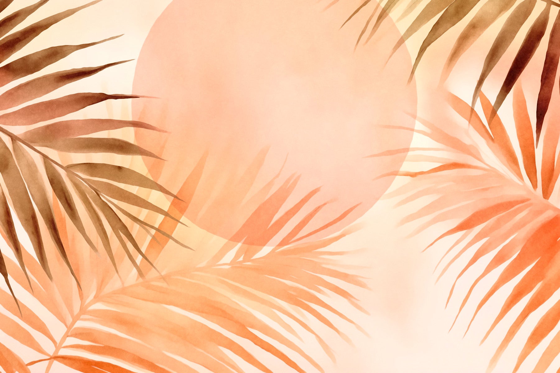 Embrace the tranquility of a tropical escape with the Tropical Palm Grove Peach Sunrise wallpaper. This serene design captures the magic of dawn as it filters through a lush palm canopy, bathing the scene in a soft, peach-toned glow. The artwork features gracefully arranged palm fronds in warm browns and muted oranges, partially obscuring a gentle, hazy sun. The watercolor-style rendering adds a touch of artistry and softness, creating a calming and inviting atmosphere. Perfect for adding a touch of warmth and relaxation to any space, this wallpaper evokes the feeling of a peaceful morning stroll through a sun-drenched palm grove. Let the subtle hues and delicate details transport you to a tropical paradise every day. Ideal for bedrooms, living rooms, or any area where you seek to create a soothing and aesthetically pleasing environment.
