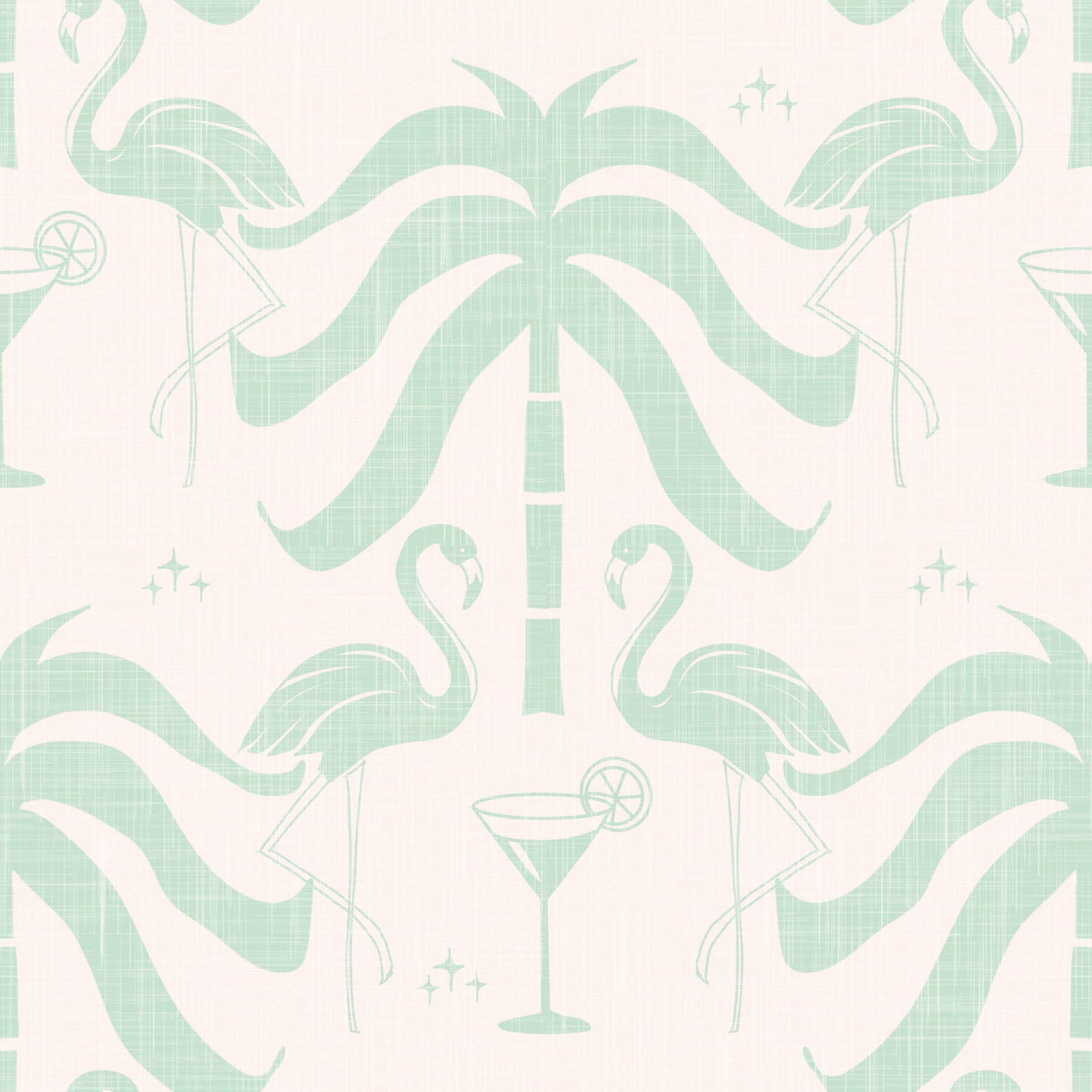 Escape to a vintage-chic paradise with our Tropical Palm Springs Flamingo Beige Aqua Green wallpaper. This delightful design evokes the glamorous era of Palm Springs with a playful twist. Imagine lounging poolside with a refreshing cocktail, surrounded by swaying palm trees and the elegant presence of flamingos. The soothing aqua green silhouettes of the flamingos and palm fronds pop gently against a soft beige backdrop, creating a harmonious and inviting atmosphere. Sparkly star details hint at sunny skies and glamorous nights. The subtle, textured linen-like effect adds depth and a touch of tactile warmth, enhancing the overall vintage aesthetic. This wallpaper is perfect for creating a stylish and relaxing sanctuary in any room, bringing a touch of retro elegance and tropical charm to your home. Let this wallpaper transport you to a dreamy Palm Springs getaway every day.