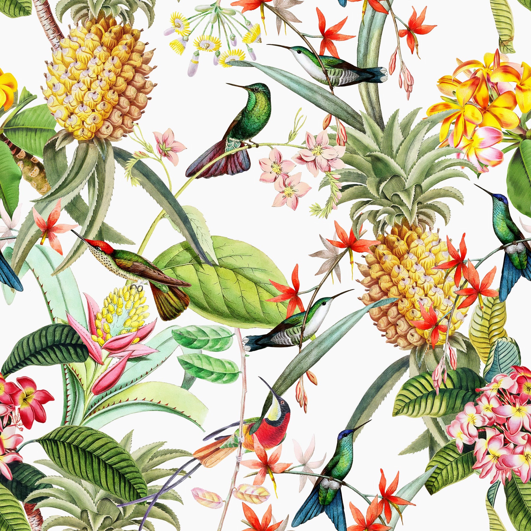 Immerse yourself in a vibrant tropical paradise with this wallpaper featuring a breathtaking array of exotic flora and fauna. Intricate watercolor illustrations depict pineapples, lush foliage, and brilliantly colored hummingbirds flitting amongst delicate blossoms. The detailed botanical renderings create a sense of serene beauty, perfect for adding a touch of the exotic to any room. The harmonious blend of warm yellows, vibrant reds, and lush greens evoke a feeling of tranquility and escape. This wallpaper is a feast for the eyes, bringing the vibrancy of a tropical rainforest directly into your home. Its seamless design ensures a cohesive and stunning visual impact.