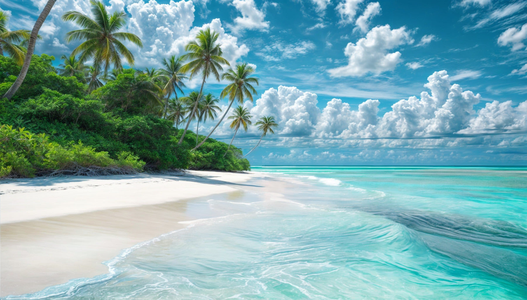 Escape to a tranquil haven with this stunning wallpaper depicting a pristine tropical beach. Lush palm trees sway gently against a backdrop of a vibrant turquoise ocean, while fluffy white clouds drift lazily across a brilliant blue sky. The soft, inviting waves lapping at the shore create a sense of serenity and peace, perfect for transforming any space into a personal oasis. Experience the ultimate relaxation and let the beauty of the tropics transport you to a world of calm and tranquility.