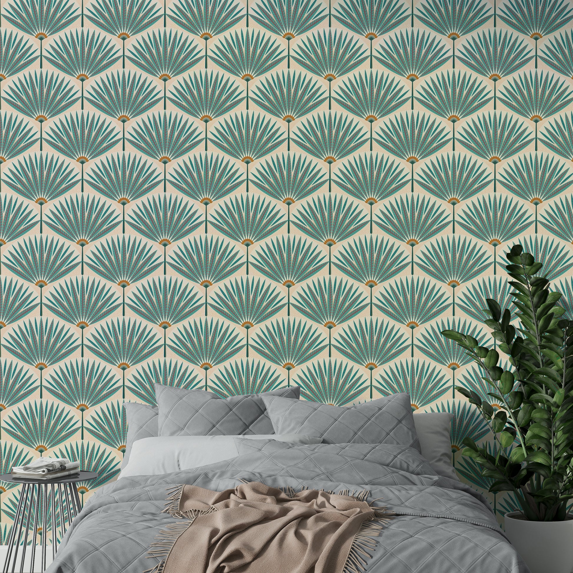 Immerse yourself in a vibrant tropical escape with this wallpaper. The design features stylized teal and burgundy palm leaves arranged in a symmetrical, almost art deco pattern, creating a sense of calm yet energetic sophistication. The subtle peachy-beige background adds a soft touch, while the dotted texture provides a playful contrast. This wallpaper is perfect for adding a touch of exotic elegance to any room in your home, from the living room to a tranquil bedroom.