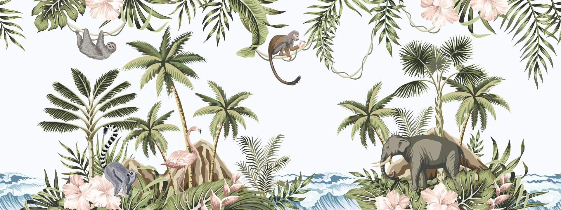 Watch your child's enthusiasm as you dress up his room walls with this tropical wallpaper mural. This hand-painted design with the sky blue background and the green tropical palm trees and the animal motifs of elephants and sloth monkeys are sure to delight your kiddo out of bounds. The color scheme is subtle pastels that give the design a vintage feel that is quaint. Complement the design with furniture in white and grey tones for an extraordinary look.