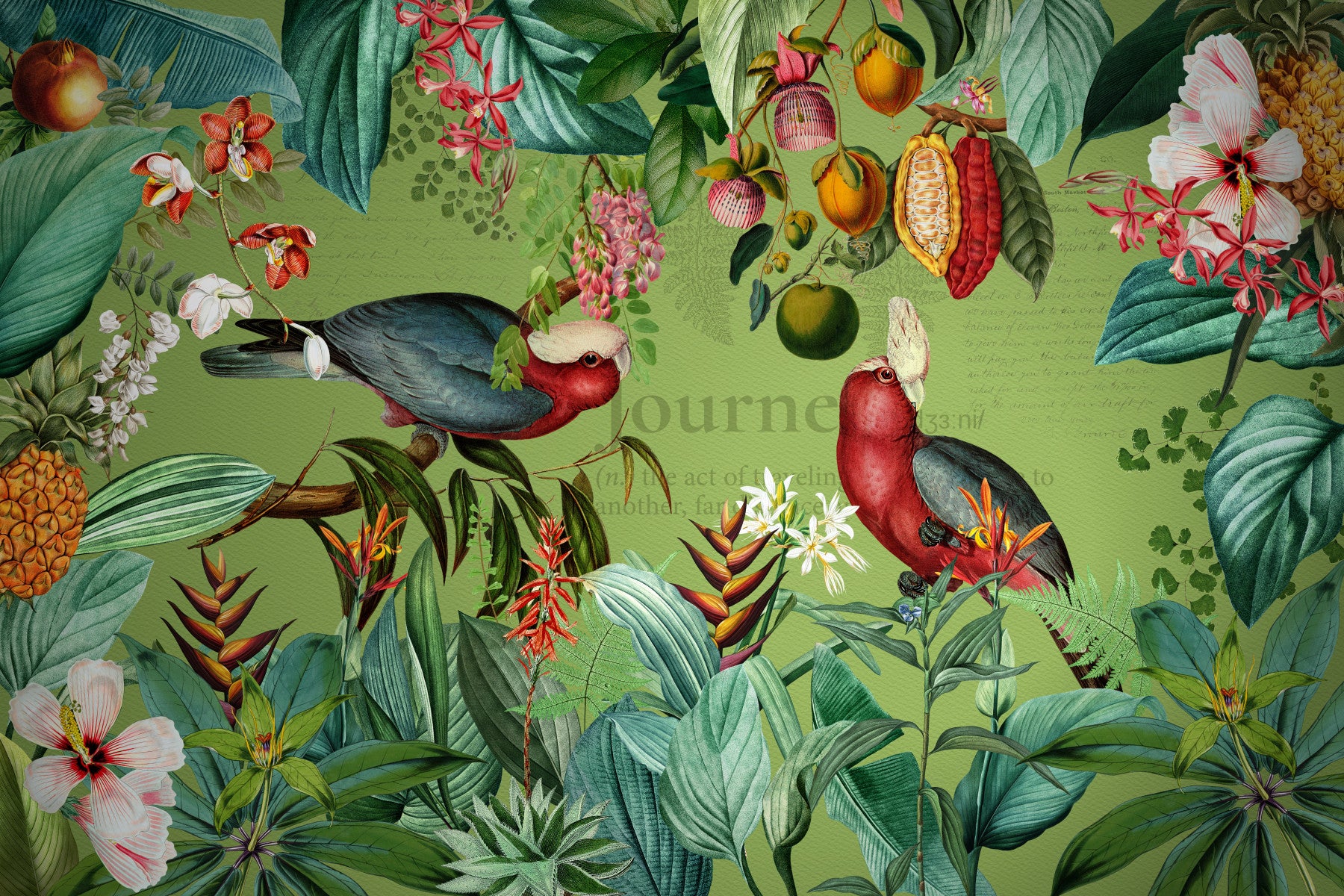 Embark on a visual voyage with this captivating wallpaper, showcasing a vibrant and lush tropical landscape. Two elegant parrots perch amidst a profusion of exotic flowers, fruits, and foliage, rendered in exquisite detail. The rich greens, reds, and oranges create a sense of warmth and tranquility, reminiscent of a secluded paradise. The vintage botanical illustrations evoke a sense of exploration and discovery, making this a perfect choice for adding a touch of exotic charm to any room. The olive green background provides a calming backdrop for the colorful flora and fauna.