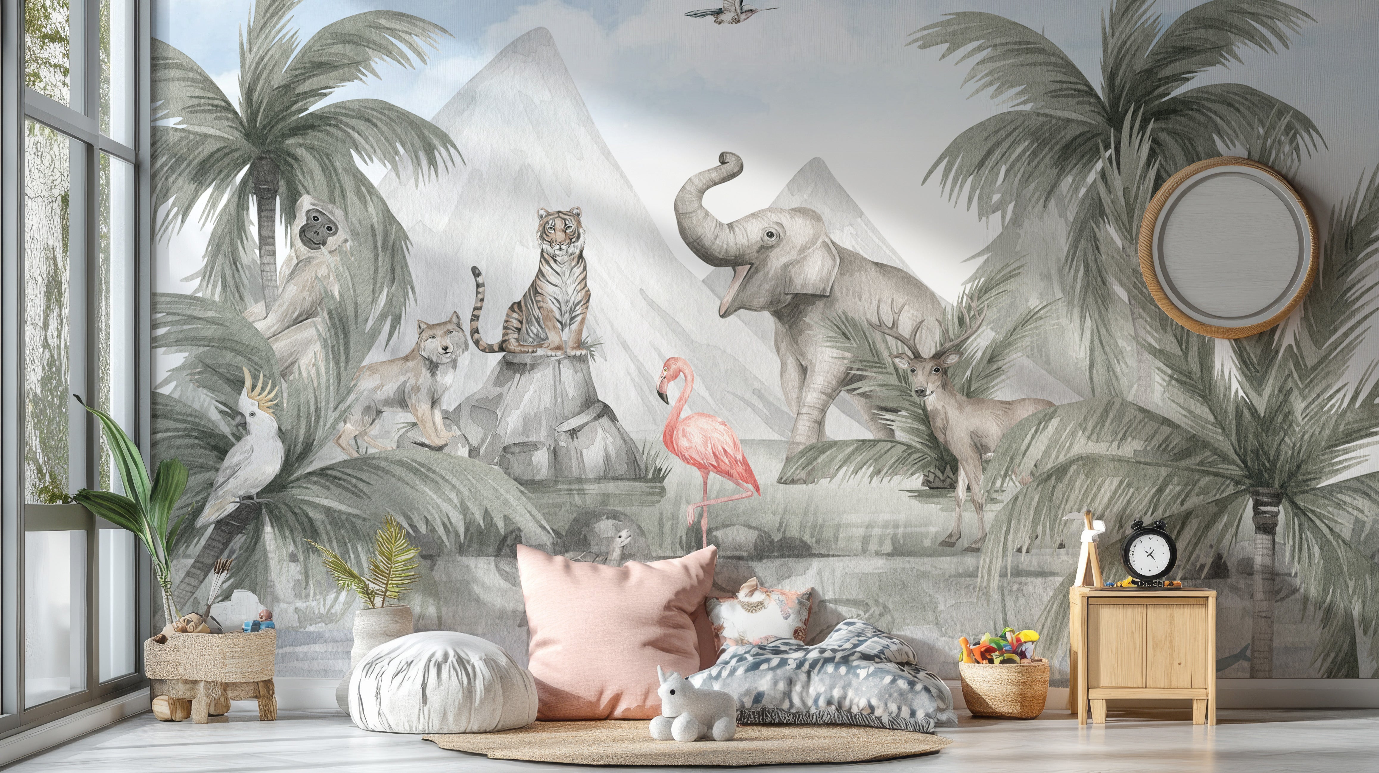 Tropical wildlife haven mural for a jungle vibe
