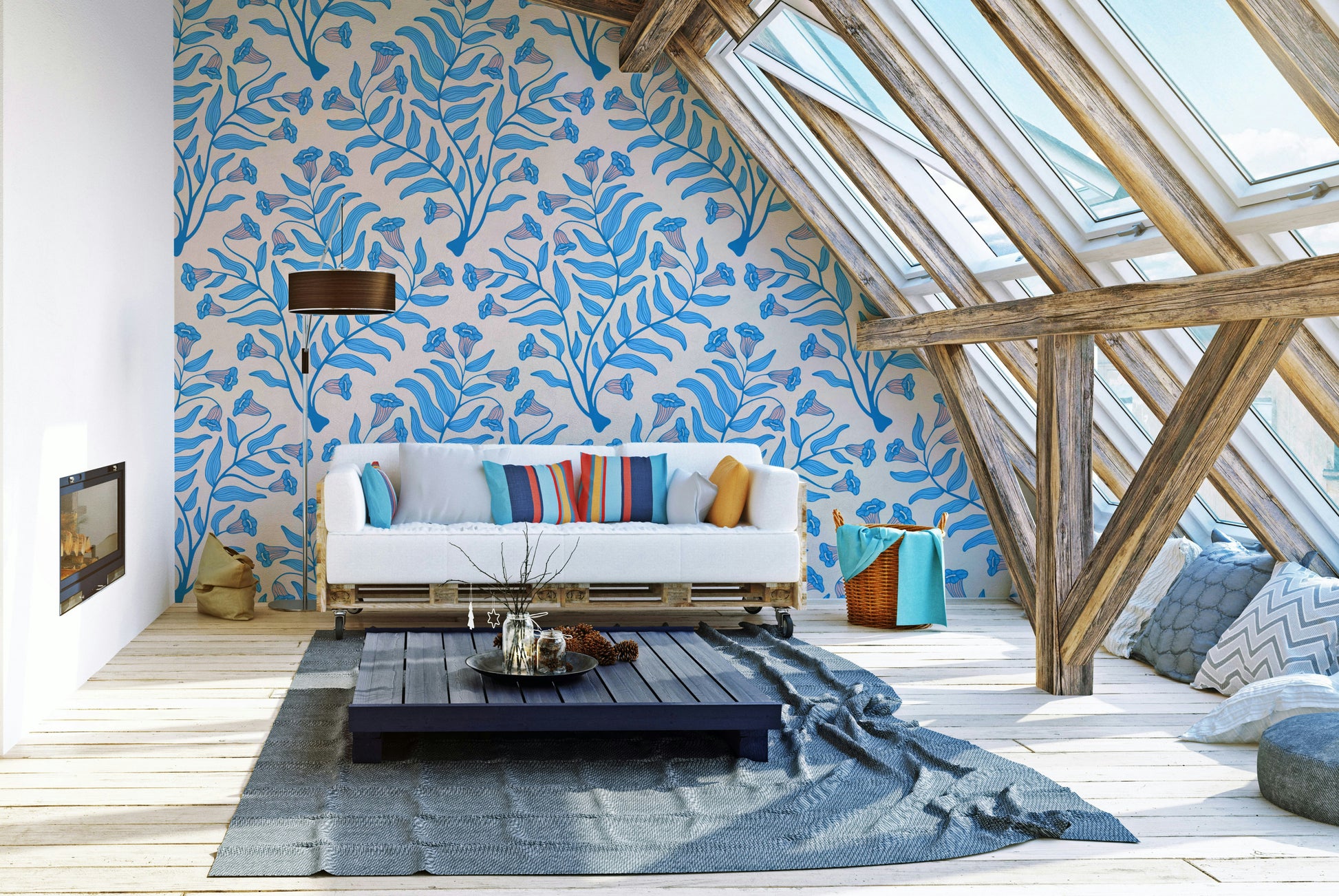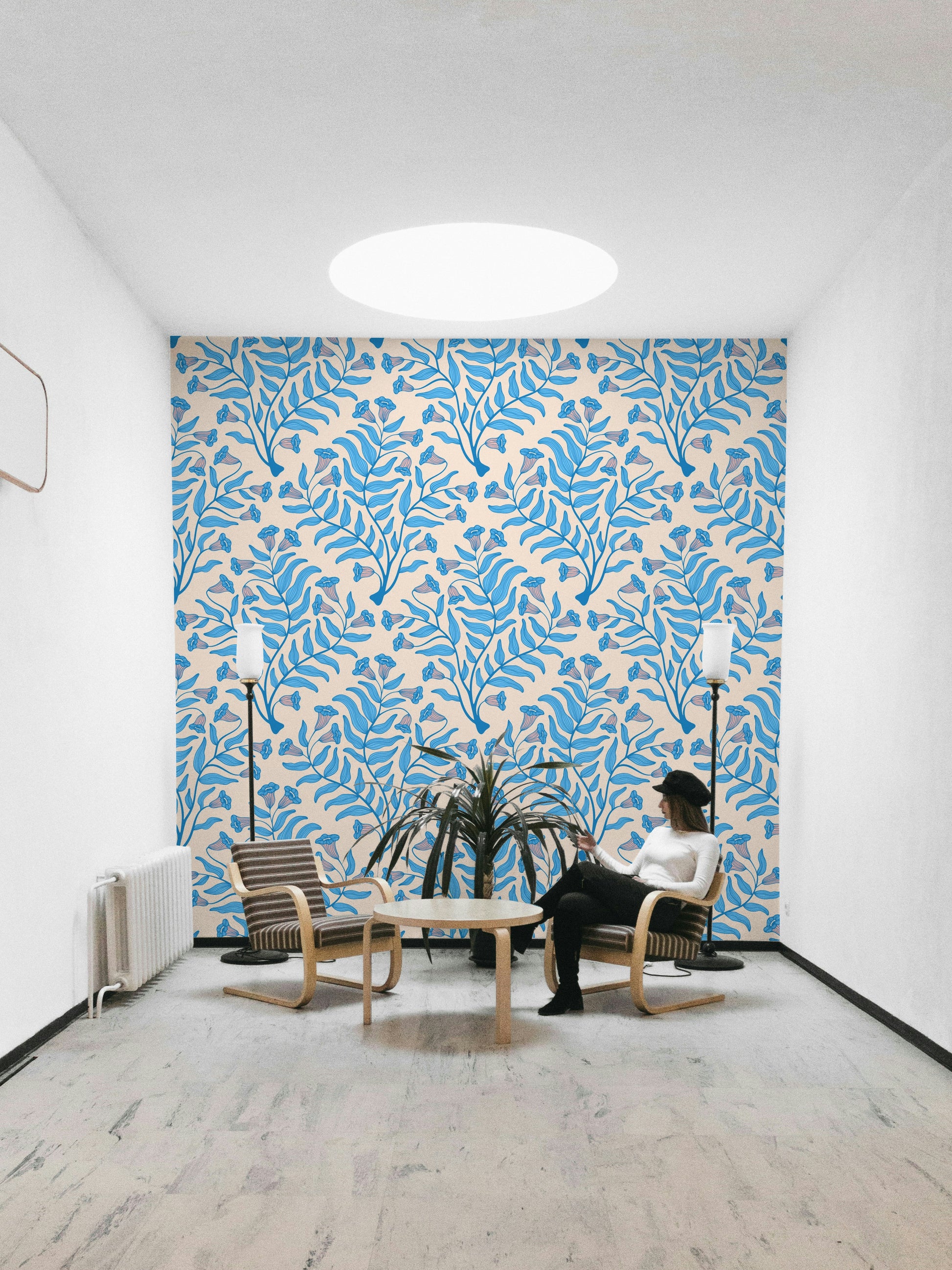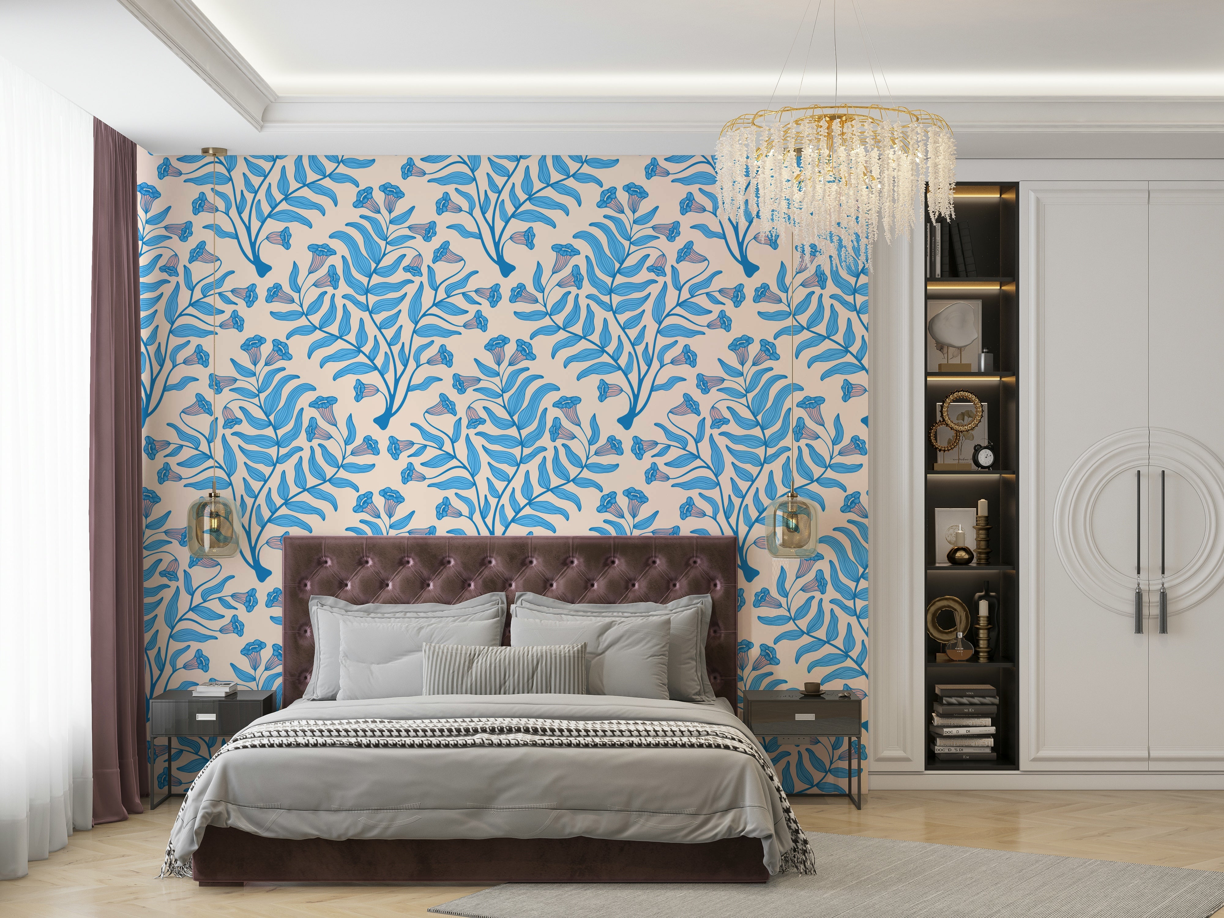 Elegant botanical wallcovering in soft blue tones