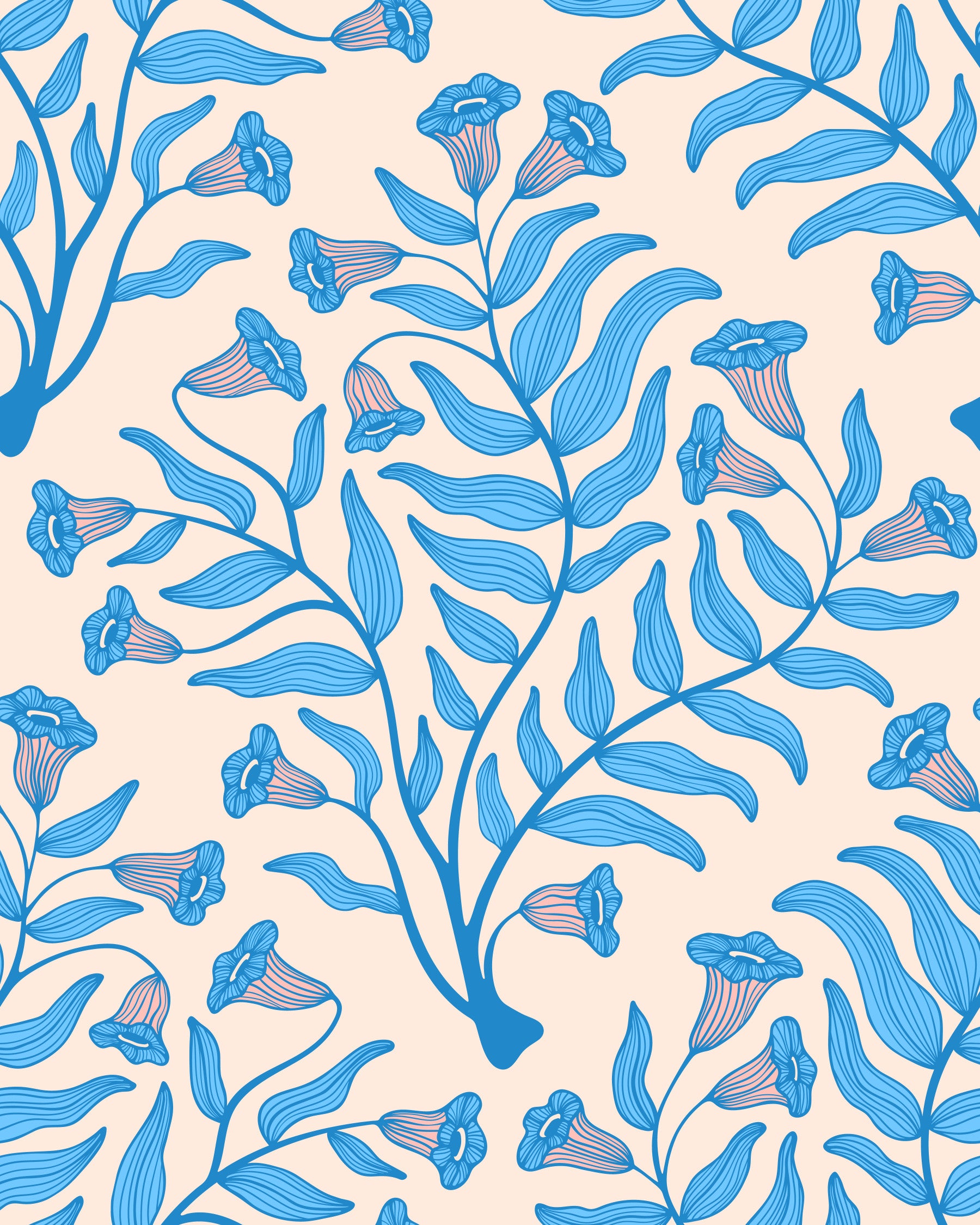 Embrace the timeless charm of this 'Trumpet Flower Damask' wallpaper, a delightful fusion of vintage floral aesthetics and botanical illustration. The intricate damask-inspired pattern features elegant trumpet flowers and stylized leaves rendered in a refreshing light blue hue. Against a soft cream backdrop, the floral design evokes a sense of serene sophistication, reminiscent of classic botanical prints. This wallpaper is perfect for creating a calming and inviting atmosphere with a touch of vintage-inspired elegance.