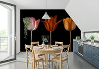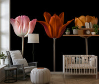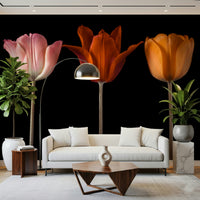 Three tulips on black background. Elevate your space with the captivating allure of "Tulip Trio," a stunning floral composition that brings a touch of refined elegance to any room. Against a dramatically dark backdrop, three exquisite tulips stand tall, each radiating its own unique charm and personality. A delicate blush-pink tulip whispers of romance and springtime, while a fiery orange bloom commands attention with its vibrant energy. Completing the trio, a soft apricot tulip exudes warmth and tranquility, creating a harmonious balance of colour and form.