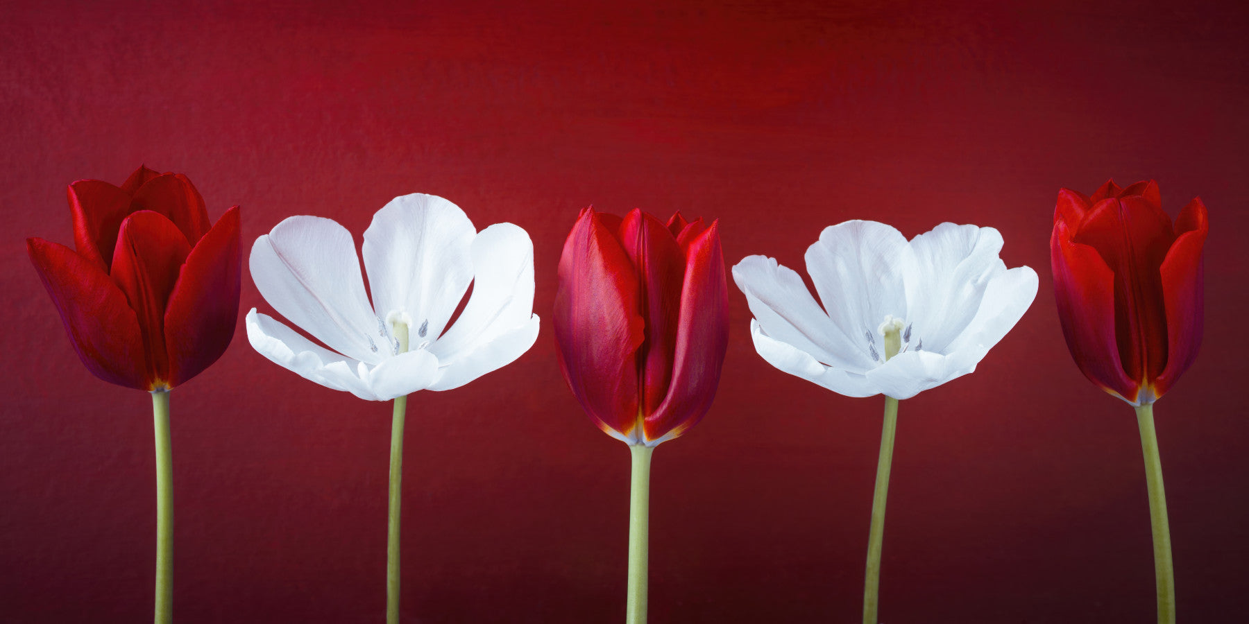 Five tulips in a row. Adorn your digital spaces with the captivating "Tulips in a Row" wallpaper, a study in floral elegance and bold colour. Against a rich, textured crimson backdrop, five tulips stand tall in a striking arrangement, their vibrant hues creating a mesmerizing visual rhythm. The deep red tulips, intense and passionate, flank the composition, drawing the eye inward to the delicate, pristine white blooms at the centre. This intentional colour contrast evokes a sense of balance and harmony, symbolising purity and love. This minimalist composition brings a touch of sophisticated beauty, perfect for those seeking a blend of modern artistry and the timeless appeal of nature. Let the simple yet striking presence of these tulips add a touch of serenity and sophistication to your everyday digital life.
