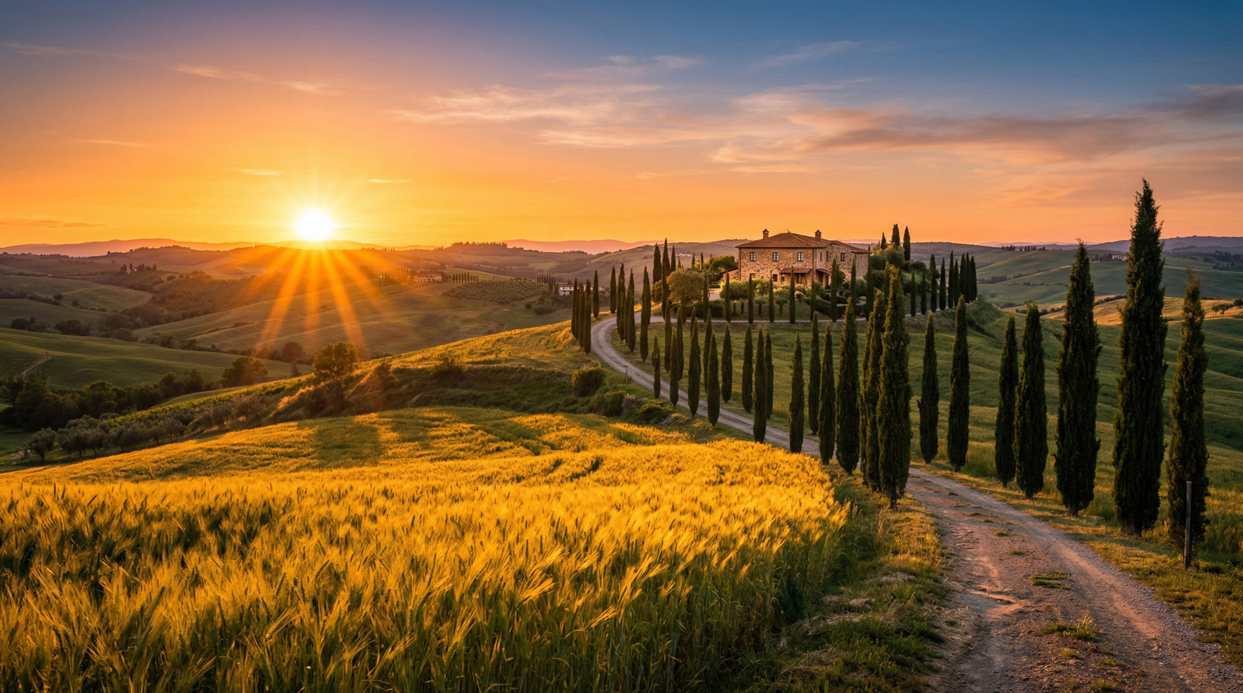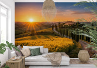 Infuse your home with the tranquil beauty of Tuscany with this stunning landscape wallpaper for walls. Golden sunlight floods rolling hills and a vast wheat field, radiating serene warmth. A classic Italian villa sits gracefully, framed by a striking line of cypress trees that follow a winding path through the idyllic countryside. The rich colour palette features warm oranges and yellows from the setting sun, complementing the deep emerald greens and an expansive azure sky. This design evokes rustic elegance, ideal for a living room, dining room, or bedroom. It transforms interior spaces, creating a peaceful escape and a captivating focal point that draws the eye.