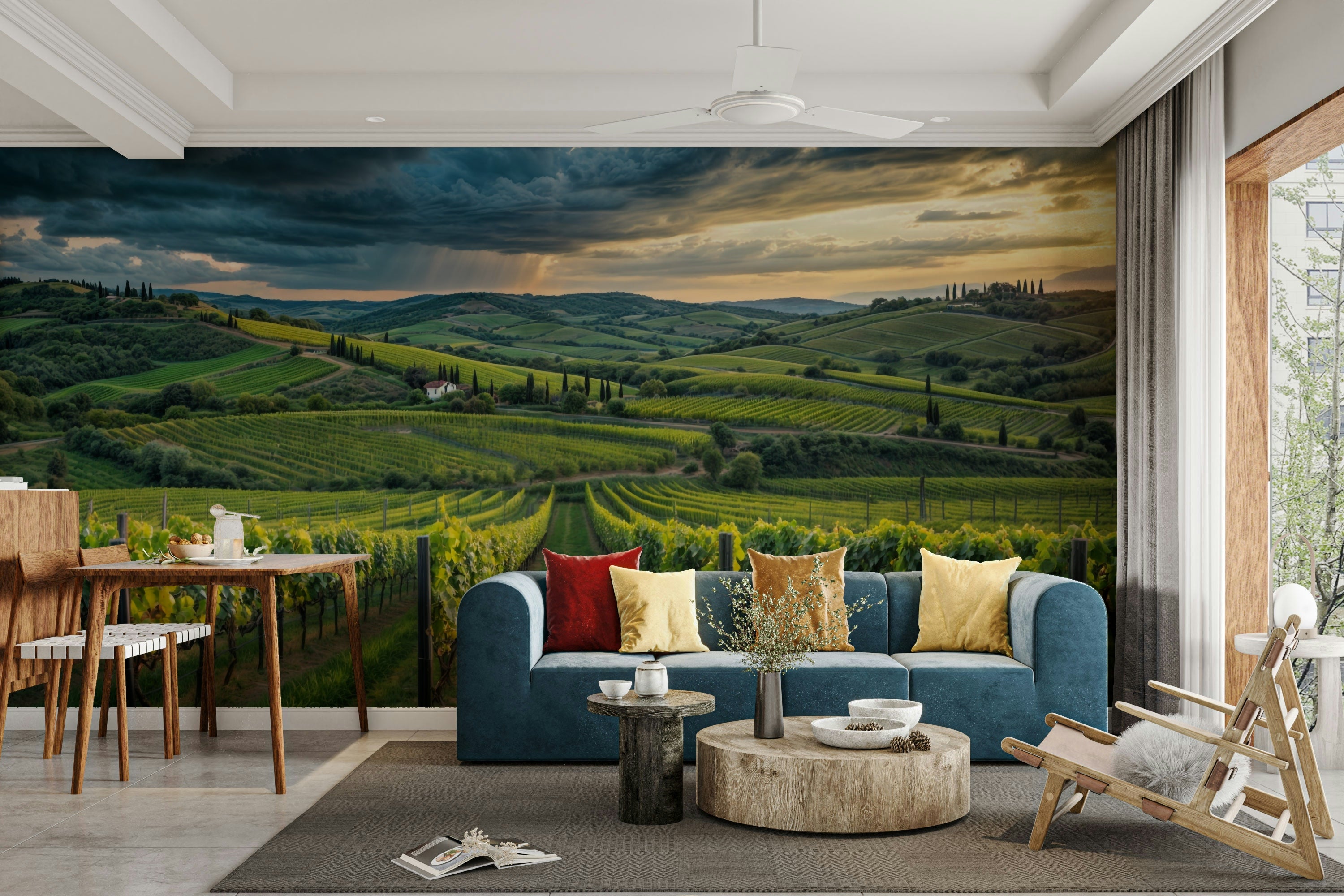 Escape to the picturesque landscapes of Tuscany with this stunning wallpaper. The image captures the essence of the region's rolling hills, meticulously cultivated vineyards, and the dramatic interplay of light and shadow. A storm gathers on the horizon, casting a captivating contrast against the golden hues of the setting sun. This wallpaper evokes a sense of tranquility and wonder, transporting you to a place of serene beauty. The lush greens of the vineyards, complemented by the dramatic sky, create a visually arresting image, perfect for adding a touch of sophisticated natural beauty to your home.