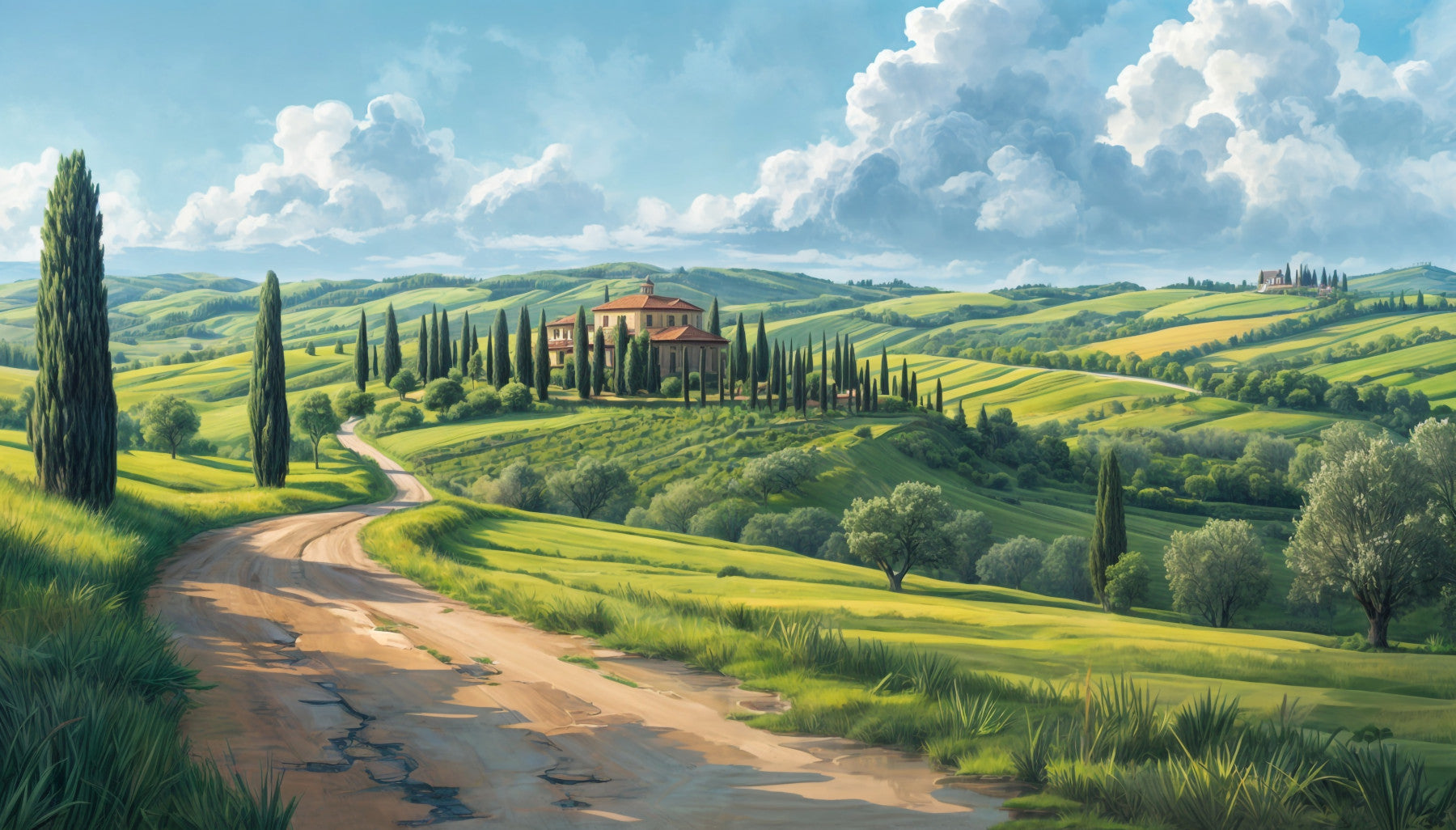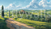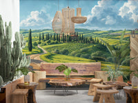 Transform any room with this idyllic Tuscan landscape. This wallpaper for walls brings the rolling hills and cypress trees of Italy into your home. Its soft, sun-drenched colour palette of greens and yellows adds warmth and serenity to living rooms, dining rooms, or bedrooms. The detailed illustration style creates a sense of depth, making your walls feel like a window to the Italian countryside. This wallpaper enhances natural light, opening up your spaces and lending a touch of rustic elegance.
