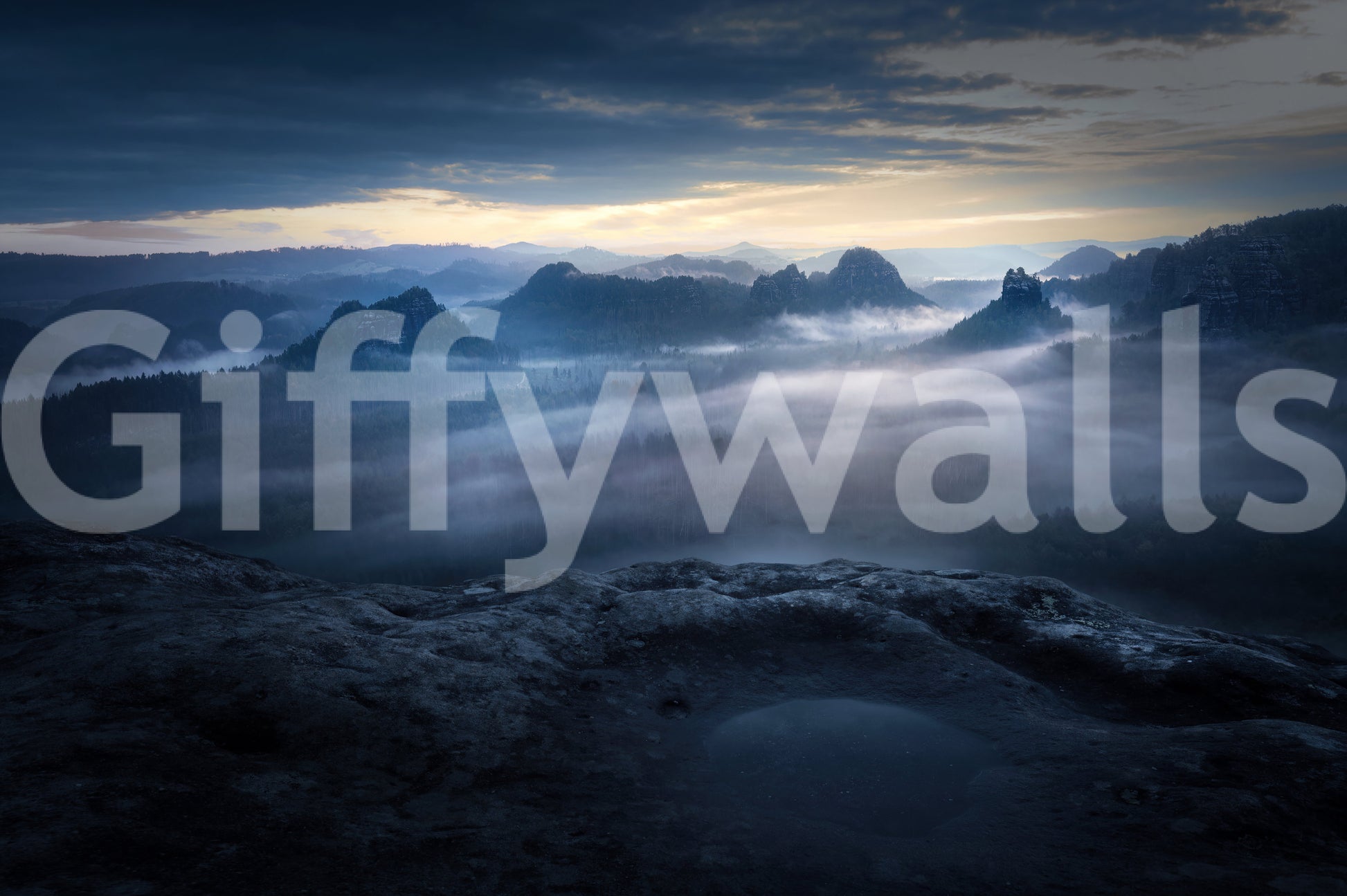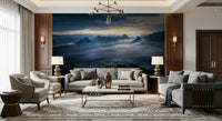 Transform your interiors with this evocative image. Hazy mountains rise in the distance, softened by a dreamlike mist. The palette features deep blues, soft yellows, and shades of grey, lending a calm feel. Install this wallpaper for walls in your bedroom, study, or even the hallway to build an atmosphere. This scene supports minimalism, modern and serene decor. It adds a touch of nature to indoor spaces.