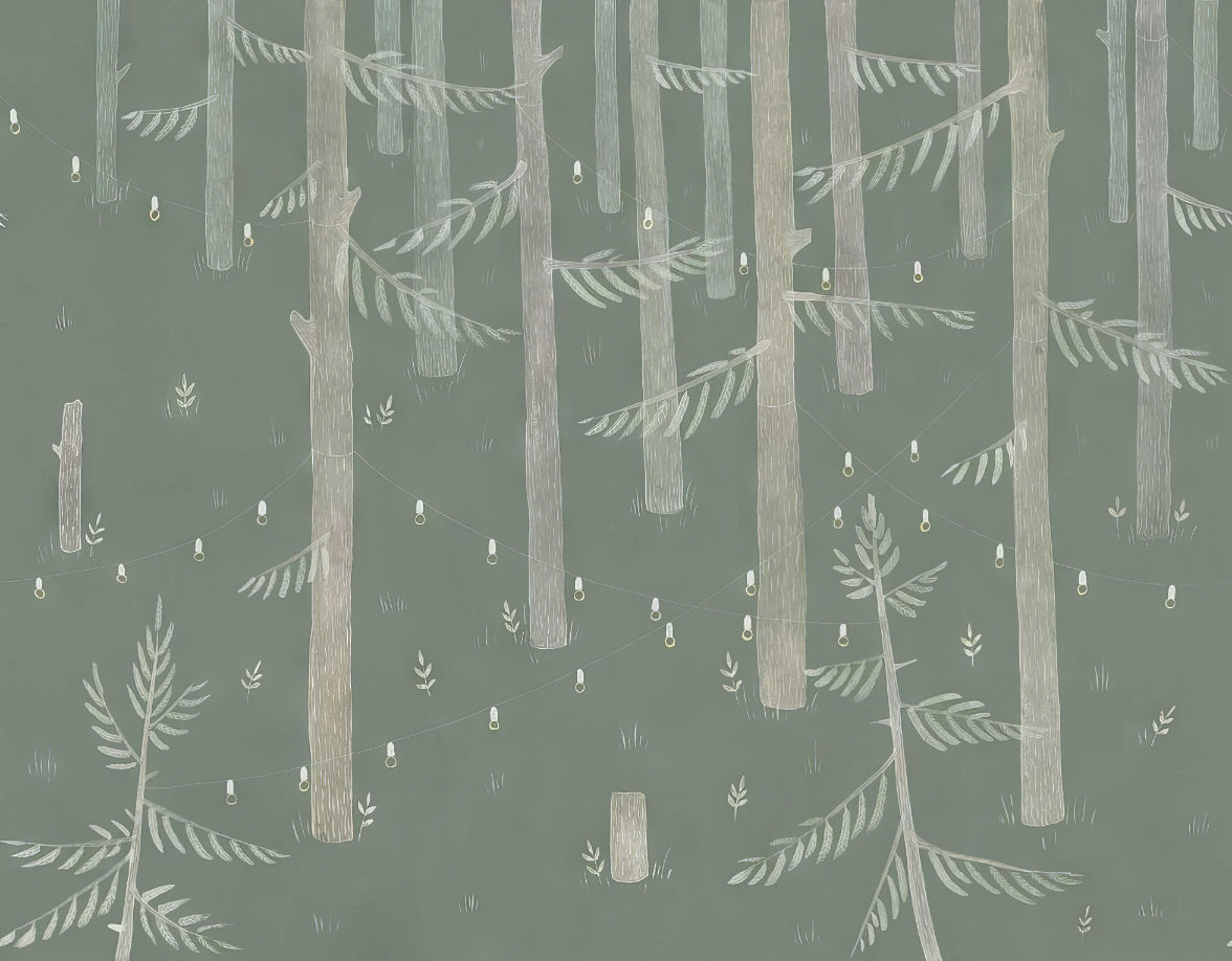 Step into a realm where the soft glimmer of fairy lights dances among serene woods with the twilight trees light mural. This unique green wallpaper invites a mystical forest into your home, casting a gentle illumination that captures the imagination. Envision slender trunks stretching skyward, their branches adorned with delicate bulbs that offer a whisper of light, creating a dreamlike tableau on your walls. Each glance reveals a new detail in this artful merger of nature and enchantment. Perfect for those who seek to infuse their abode with a touch of woodland magic, this mural is more than a simple wall covering it's a portal to a world aglow with whimsy.