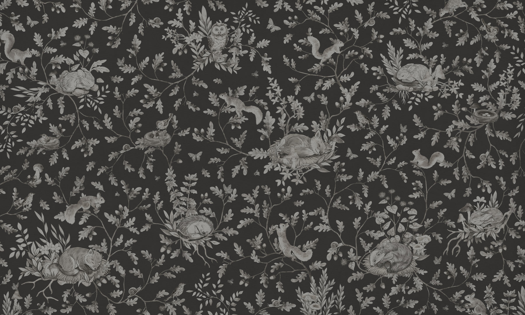 Invite the calm of the forest into your home with this distinctive wallpaper for walls. This pattern depicts a hushed woodland scene with dreaming creatures nestled within oak branches, all rendered in muted greys against a dark base. Ideal for bedrooms or nurseries, this design creates a tranquil atmosphere. The pattern's classic look integrates seamlessly with various decor styles. Let this wallpaper bring the quiet allure of the woods to your interior spaces.