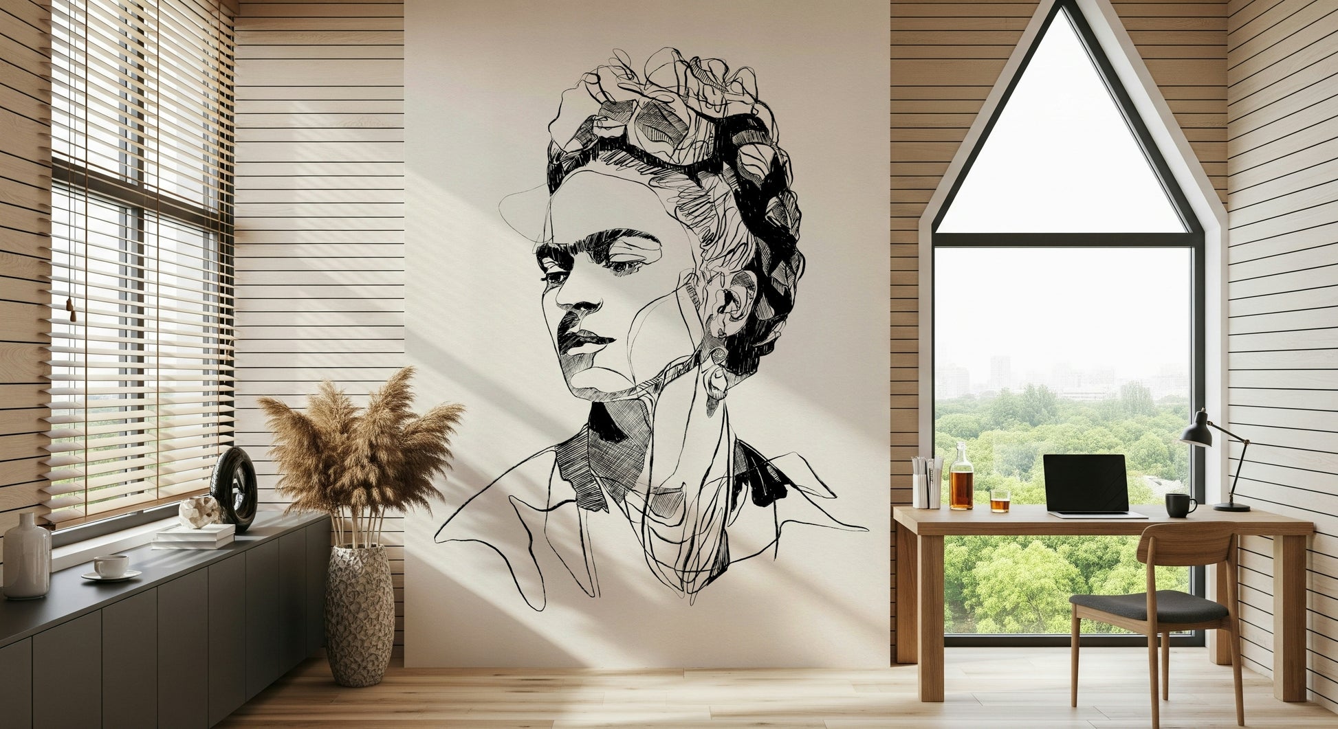 Transform your interiors with a unique touch of artistic expression with this striking wall art. The bold, intricate line work captures the essence of modern elegance, inspired by the vibrant spirit and resilience of an iconic Mexican muse. Evoking floral crowns, vivid dreams, and the poetry of self-expression, this piece celebrates the timeless strength and beauty of individuality. Perfect for adding character and intrigue to any room, it harmonises effortlessly with both contemporary and classic décor.