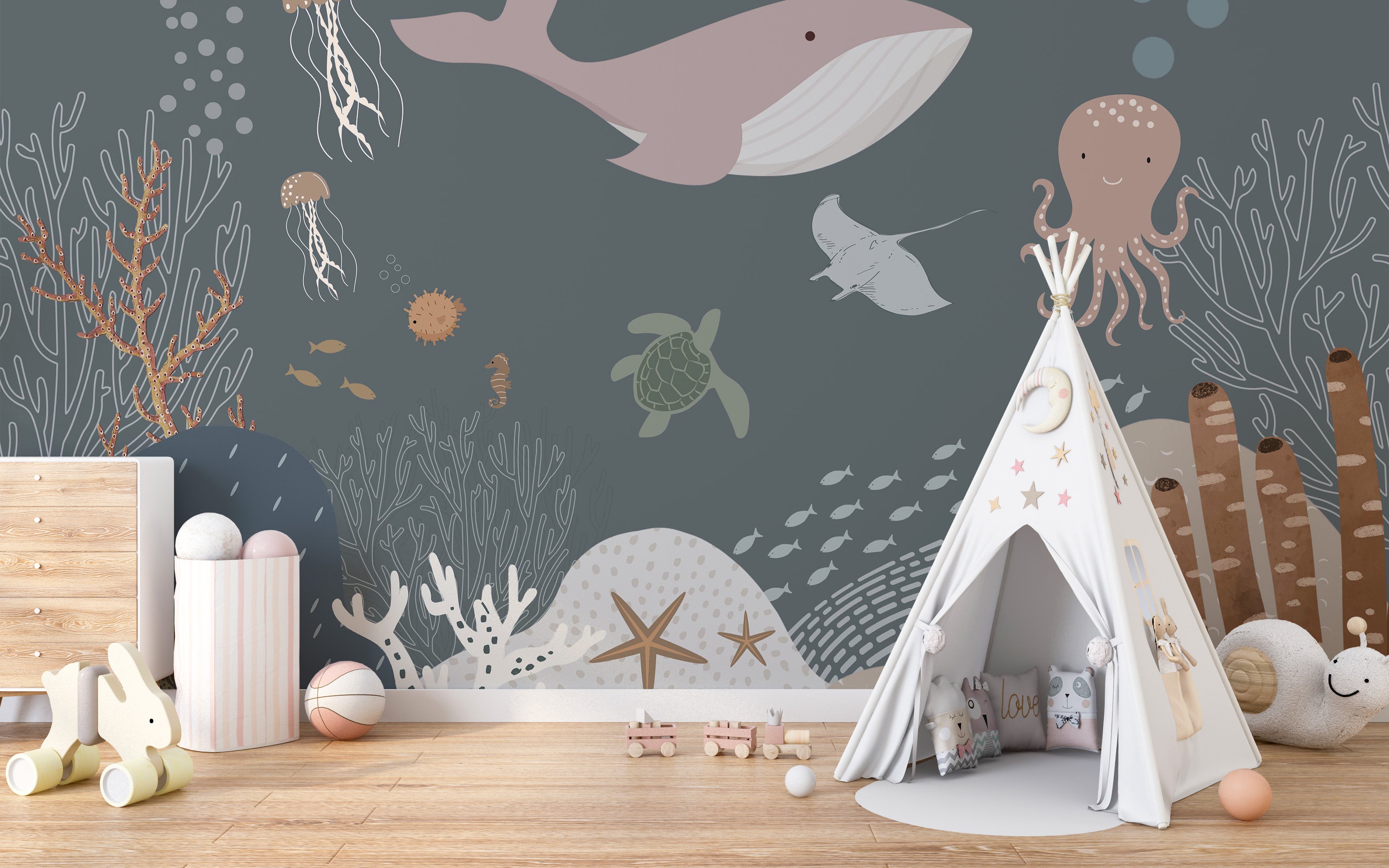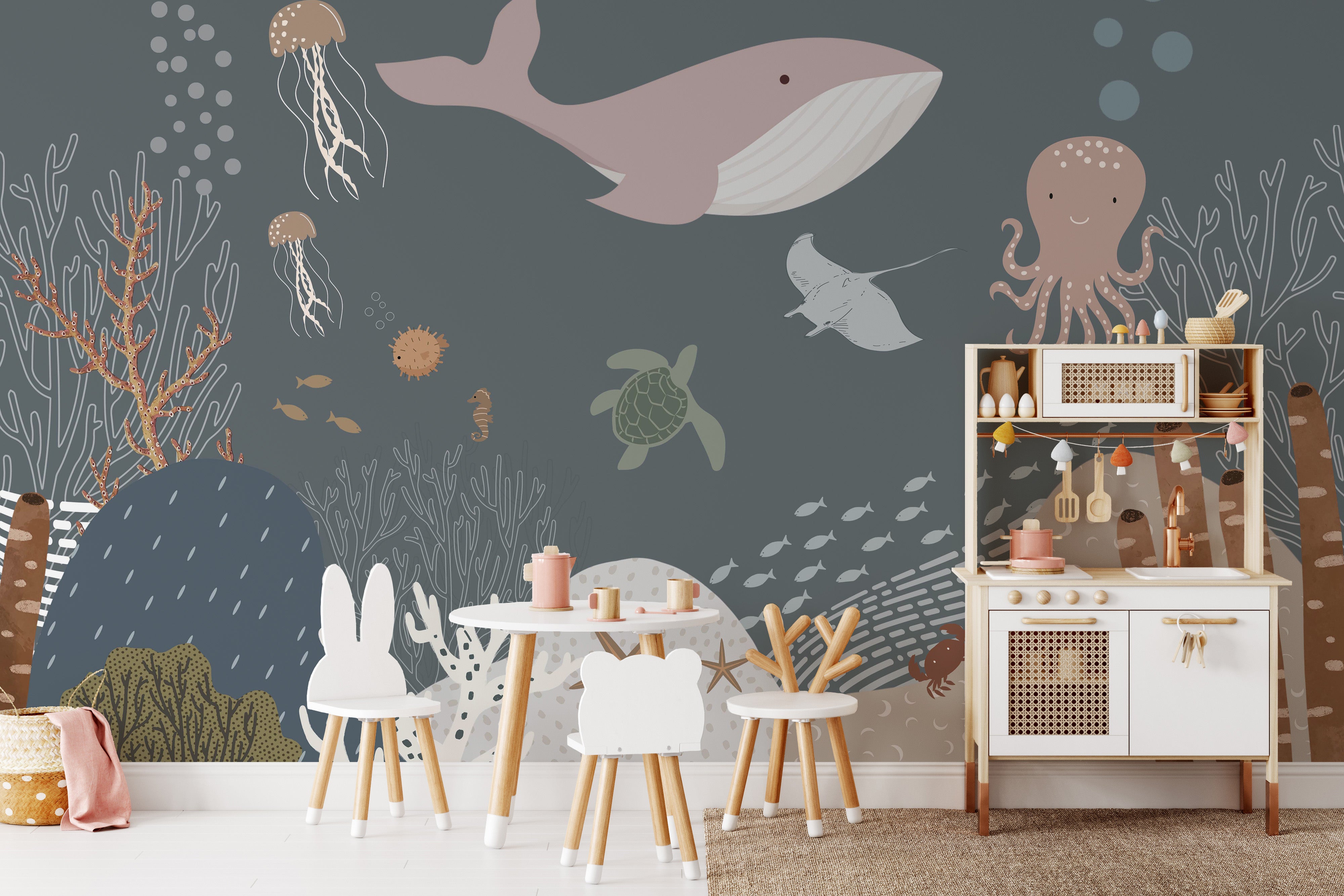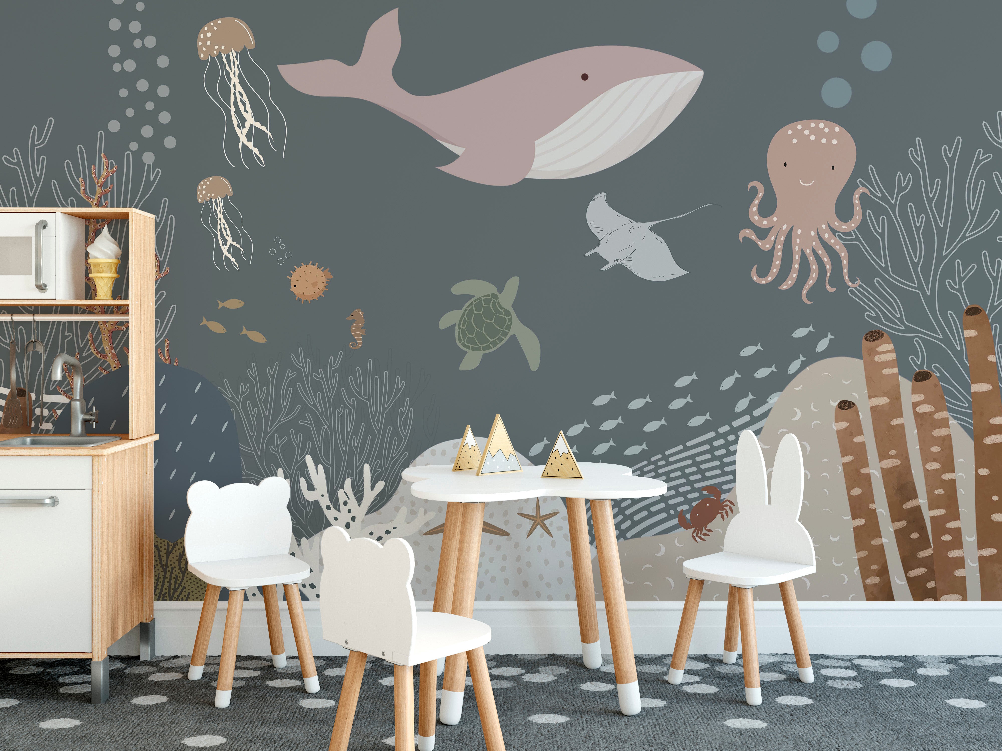 Bring the magic of the ocean to your little one's bedroom with stunning marine creature wallpaper. Your child will love being surrounded by colorful and fascinating sea creatures, from friendly dolphins to majestic whales. With nursery wallpaper, you can easily and affordably create a playful and imaginative space for your child to learn and grow. So let your child's imagination run wild with a breathtaking marine creature mural wallpaper. It's the perfect addition to any sea-loving child's bedroom!