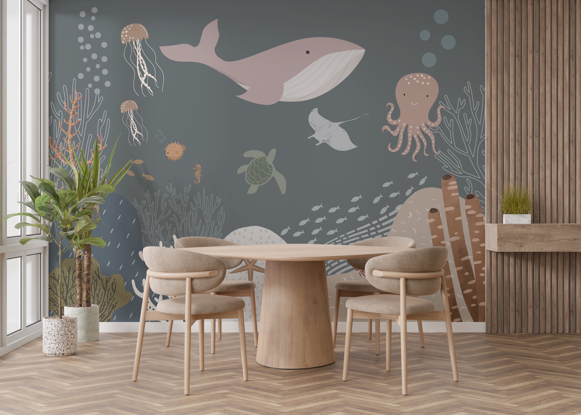 Aqua-themed ocean mural with playful fish.