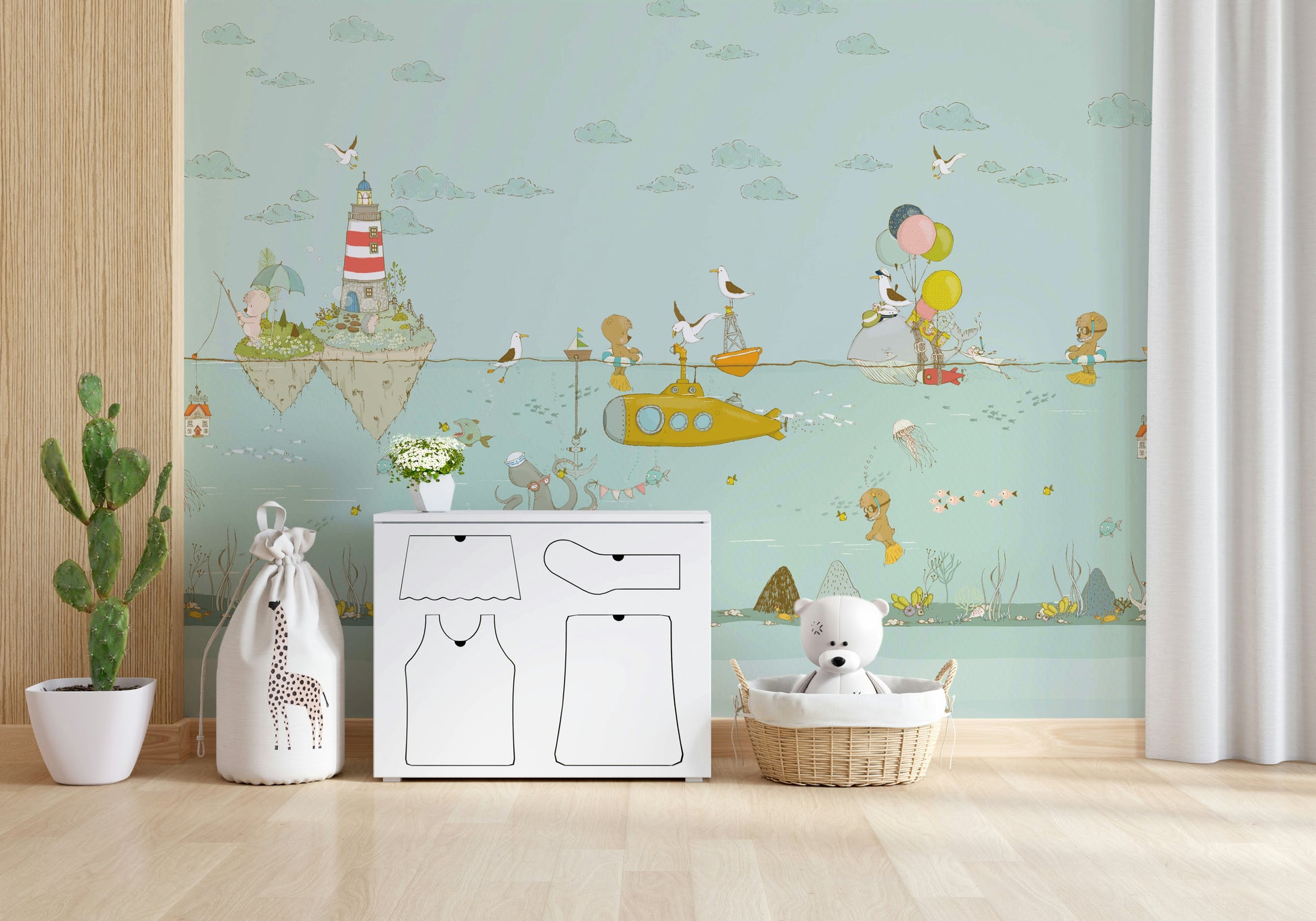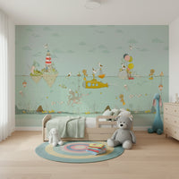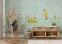 Dive into a world of playful charm with this captivating wallpaper for walls. It features a lighthearted underwater scene with adorable bears, a cheerful yellow submarine, and whimsical sea creatures. Gentle pastel tones and hand-drawn details create a soothing atmosphere. Perfect for nurseries, kids' rooms, or playrooms, this design adds a touch of imagination. The design complements interiors with its sweet characters and calm palette.