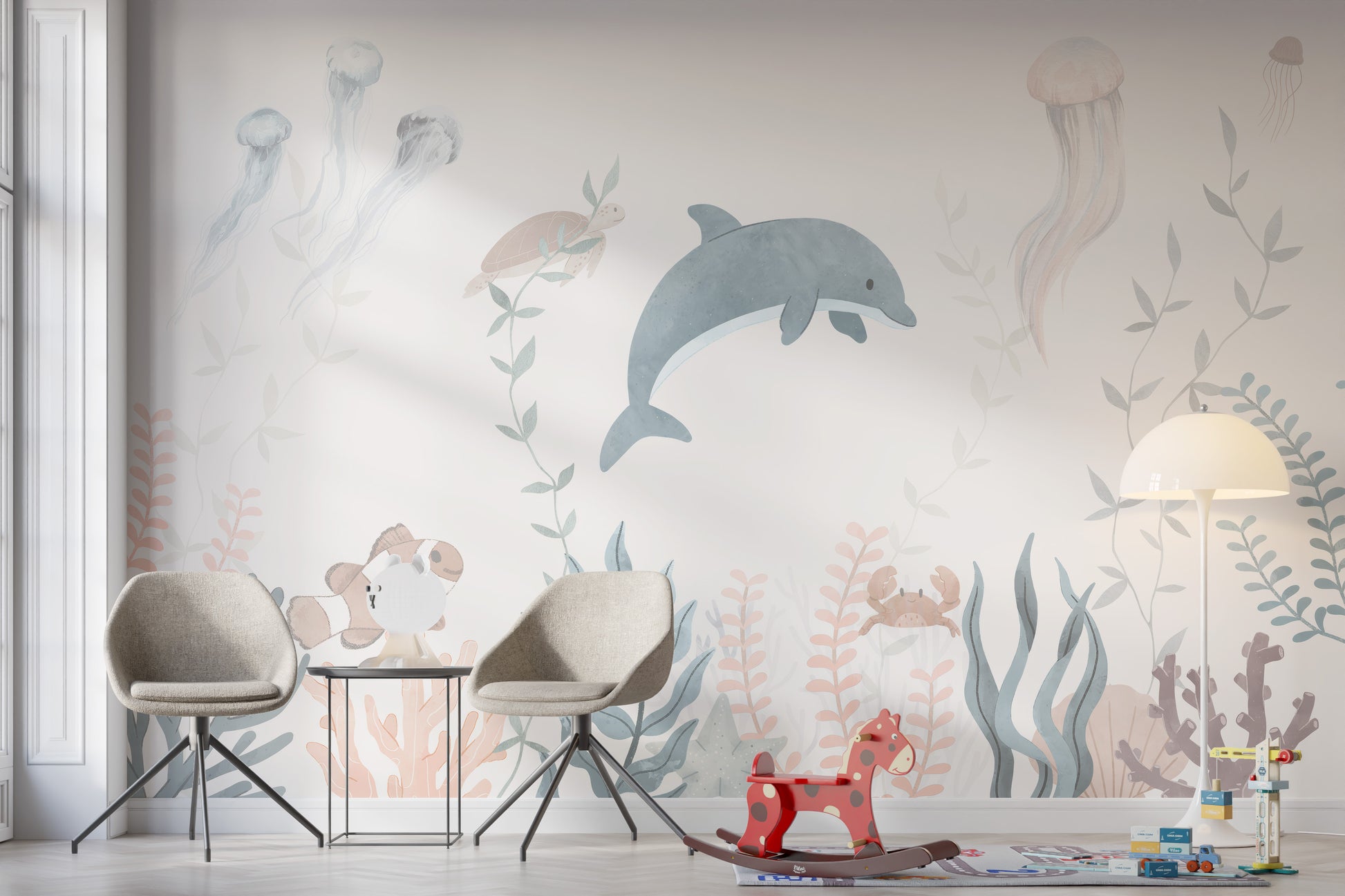 The underwater wonders wall mural offers a dynamic and engaging ocean scene, perfect for any kids room. The mural is rich with imagery of playful dolphins, gentle turtles, and ethereal jellyfish, providing an educational background that engages children in marine life. It serves as a perfect blend of fun and learning, with vivid colors and detailed designs that stimulate young imaginations. Plus, its durable materials are built to withstand the daily activities of any energetic child. The durable materials ensure a lasting finish that resists the wear and tear of everyday play. Order now to bring a vibrant slice of the ocean into your home!