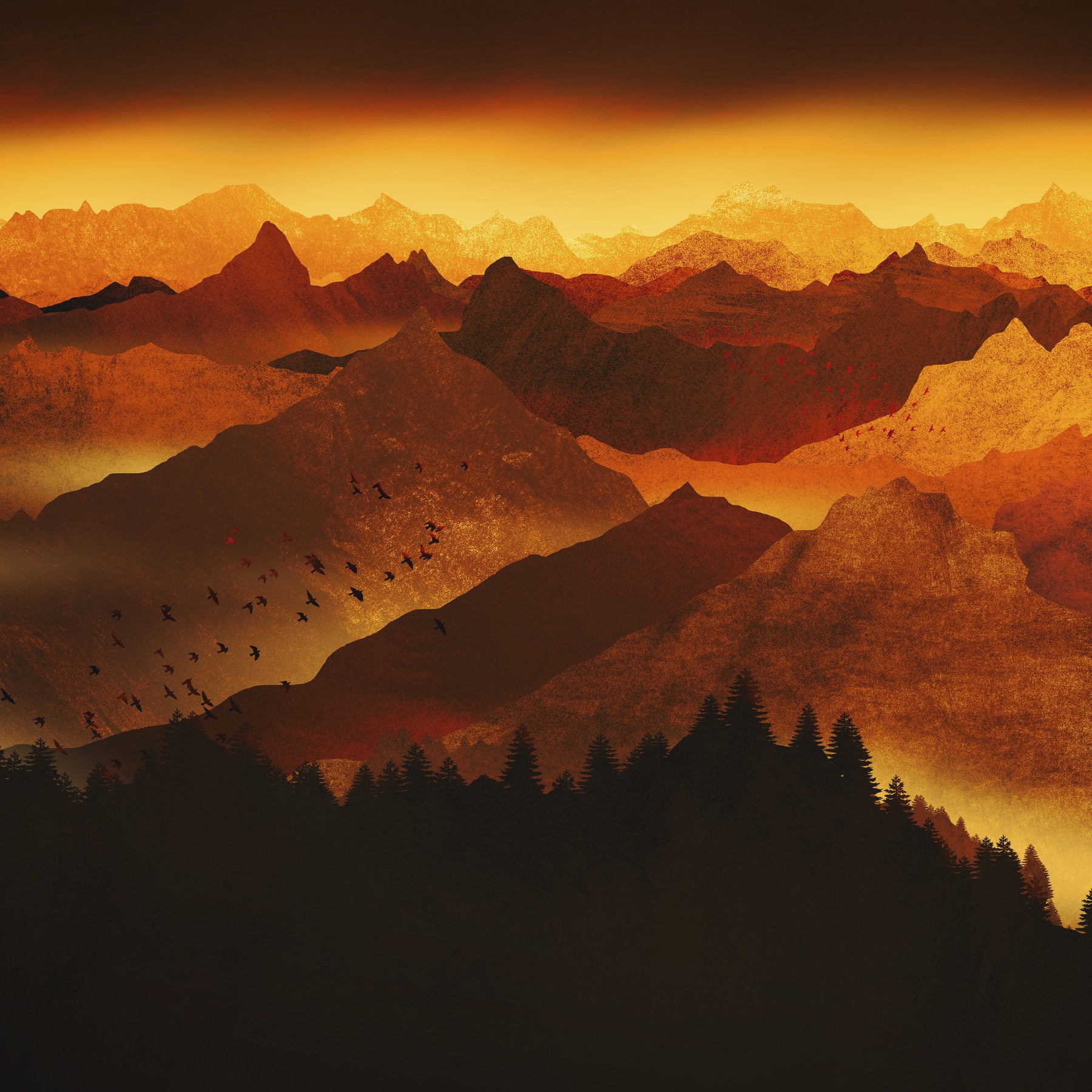 Abstract fire landscape mural for a workspace with minimalist shelving and metal accents.