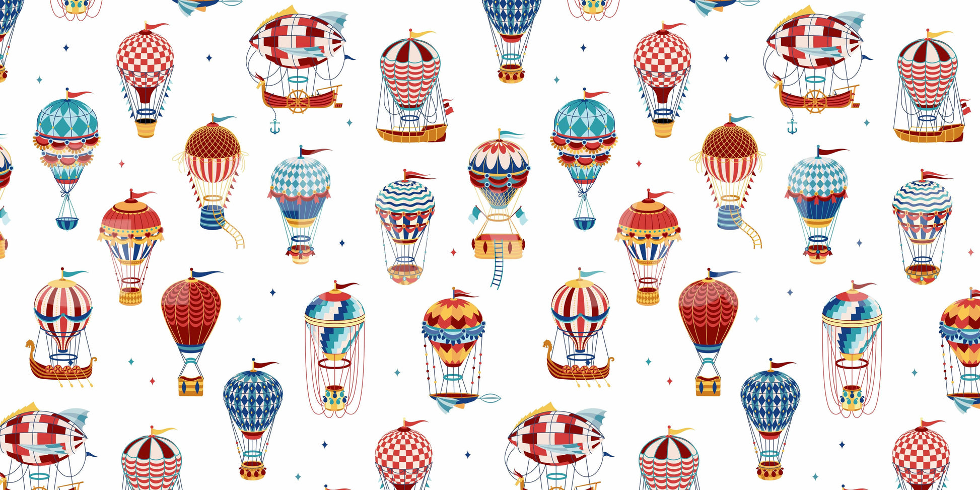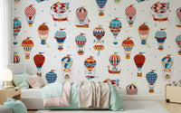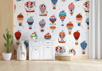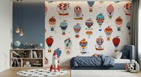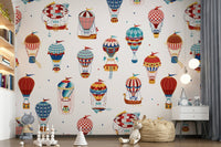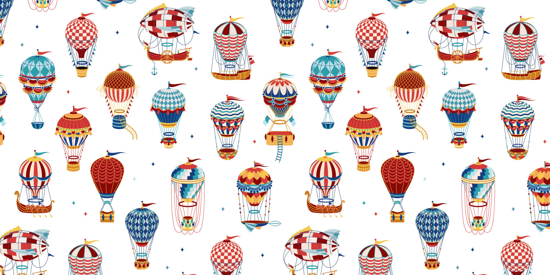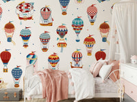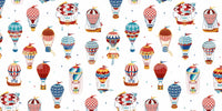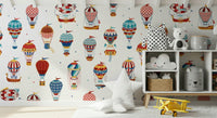 Let your imagination soar with this playful hot air balloon pattern! The whimsical design features colourful balloons in a variety of styles, perfect for adding a touch of adventure to any room. It blends reds, blues and yellows on a clean white backdrop. This wallpaper for walls makes a great choice for kids' rooms, playrooms, or anywhere you want to create a cheerful and uplifting atmosphere. It complements vintage and modern interiors.