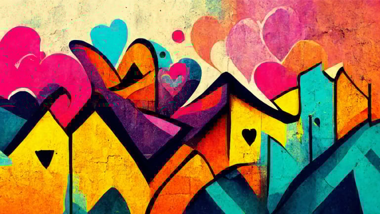 Colorful urban love-themed graffiti wallpaper mural for homes.