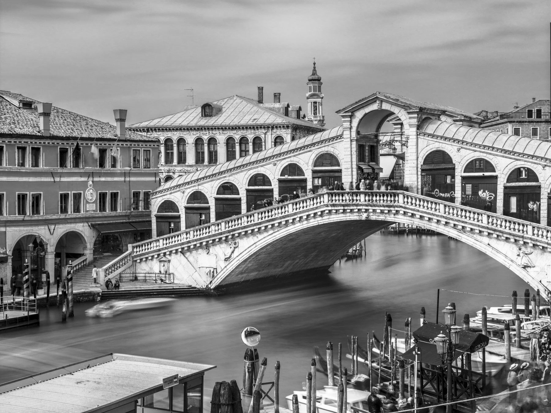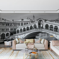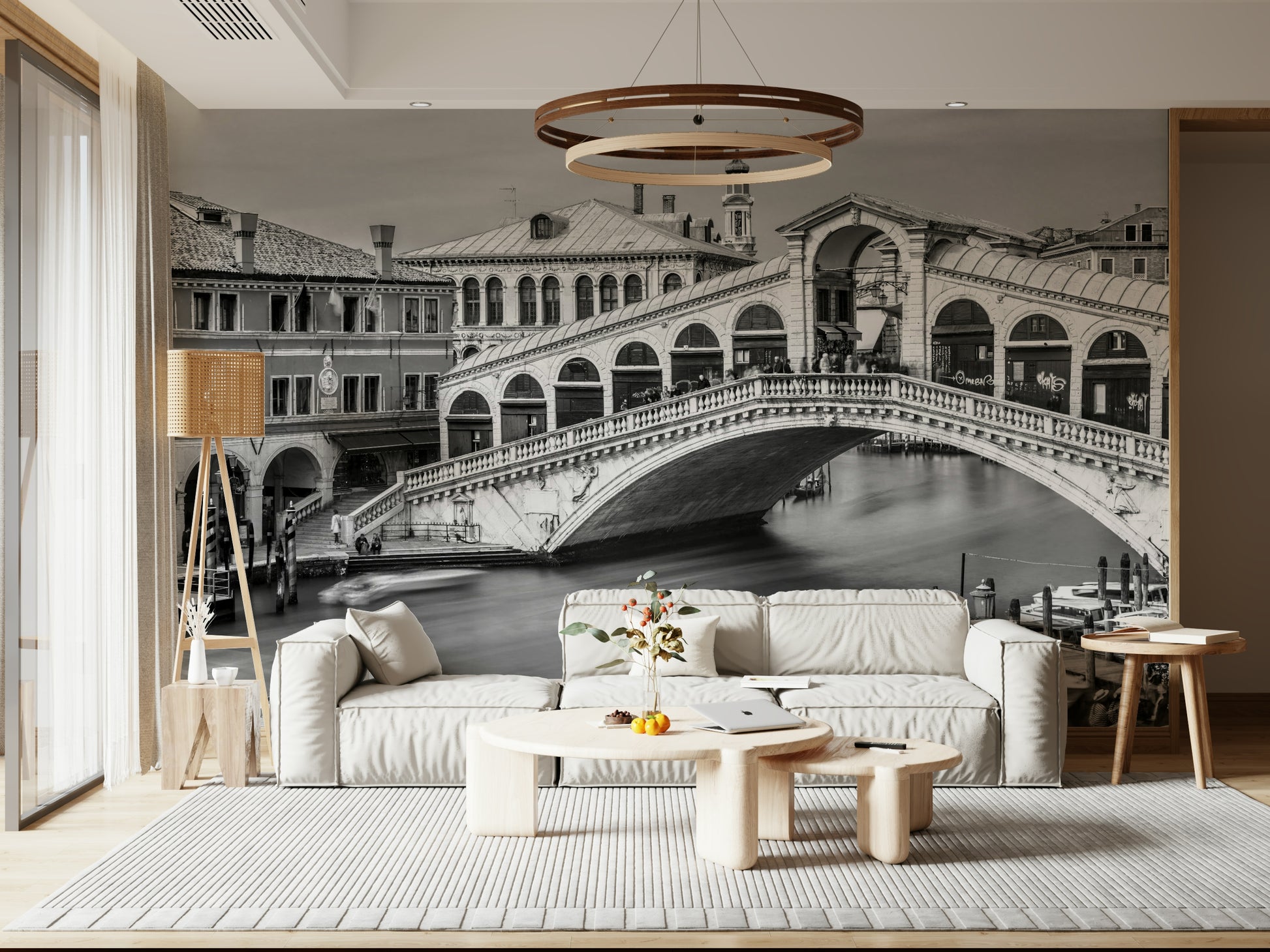 Famous Rialto Bridge, Venice, Italy. Invite the timeless allure of Venice into your living space with "Venetian Bridge Serenity." This monochrome artwork captures the iconic Rialto Bridge in a moment of quiet contemplation, transforming your walls into a window overlooking the Grand Canal. The intricate details of the bridge's architecture, the gentle flow of the water below, and the surrounding historic buildings evoke a sense of peace and timelessness. The monochromatic palette enhances the architectural details and creates a sophisticated and calming atmosphere. Imagine the subtle textures and quiet grandeur adorning your walls, infusing your room with the romantic spirit of Venice, a serene escape from the everyday.