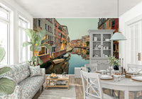 Transport yourself to Venice with this stunning canal scene. It shows calm waters reflecting the colourful buildings of this iconic city. Warm light glows from the lamps and buildings, creating a serene atmosphere. The watercraft add a touch of charm. This wallpaper for walls brings a piece of Italy into your home. Its detailed architecture and tranquil setting works wonderfully in a living room, bedroom, or office. The design complements interiors and adds a touch of global style.