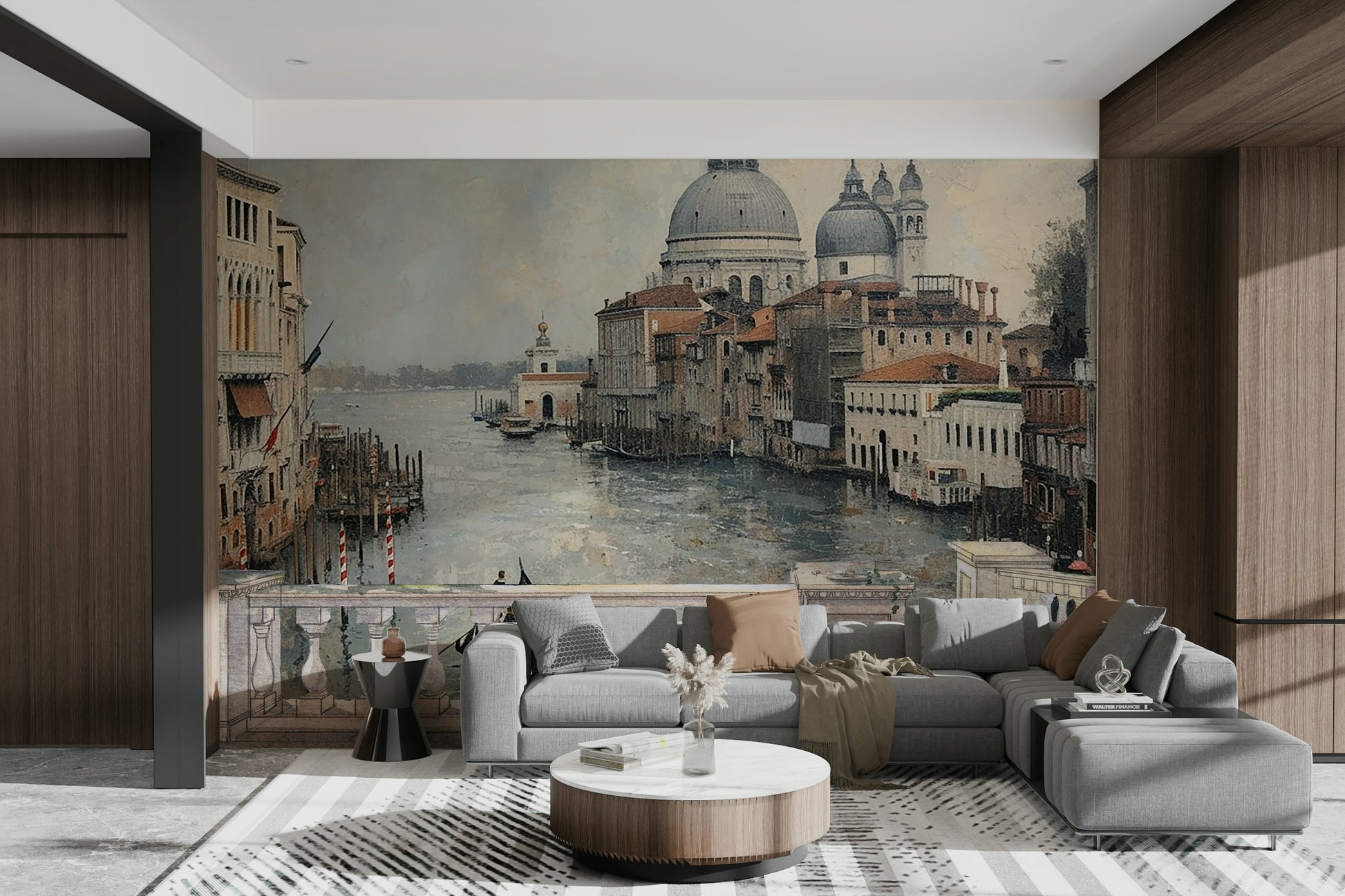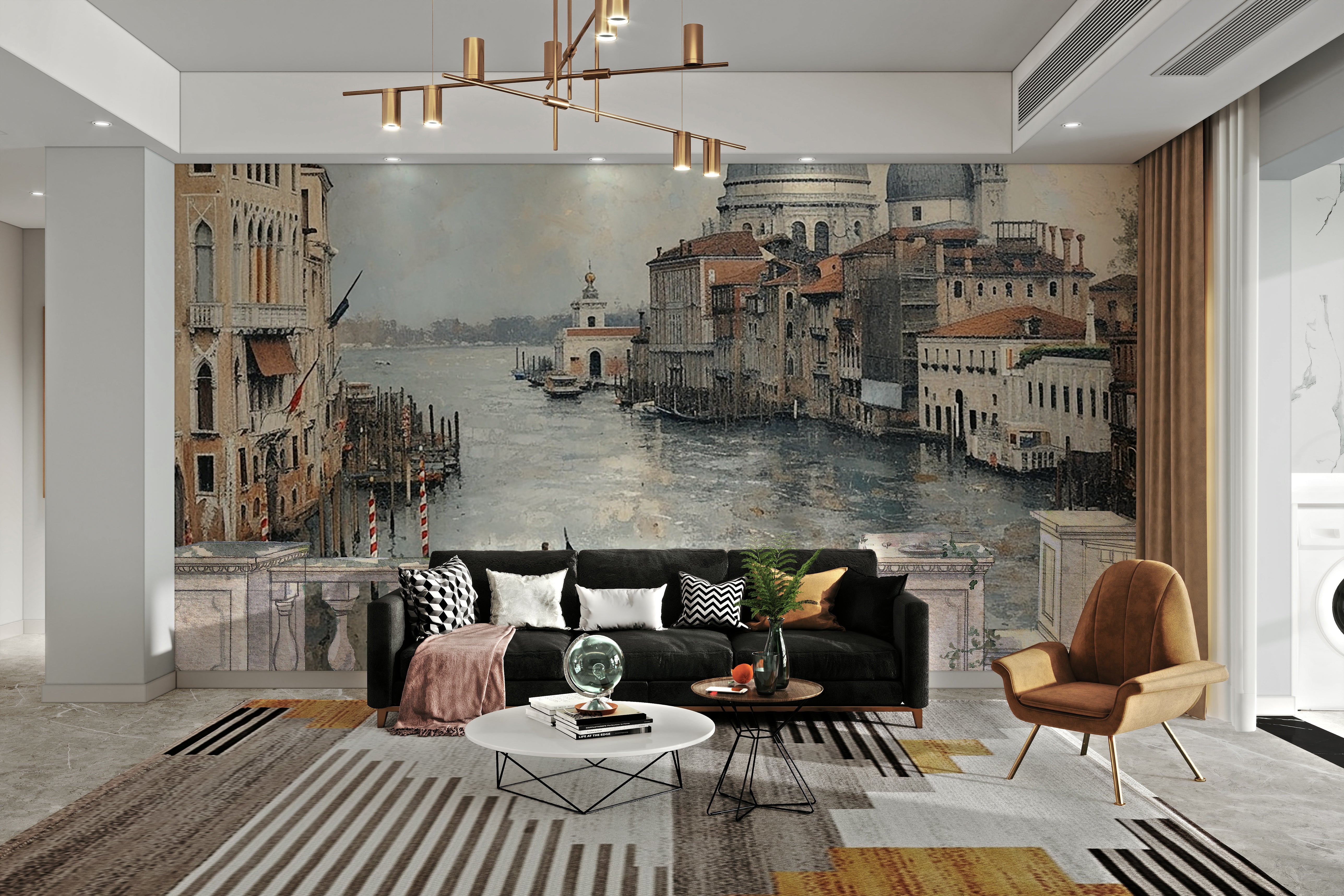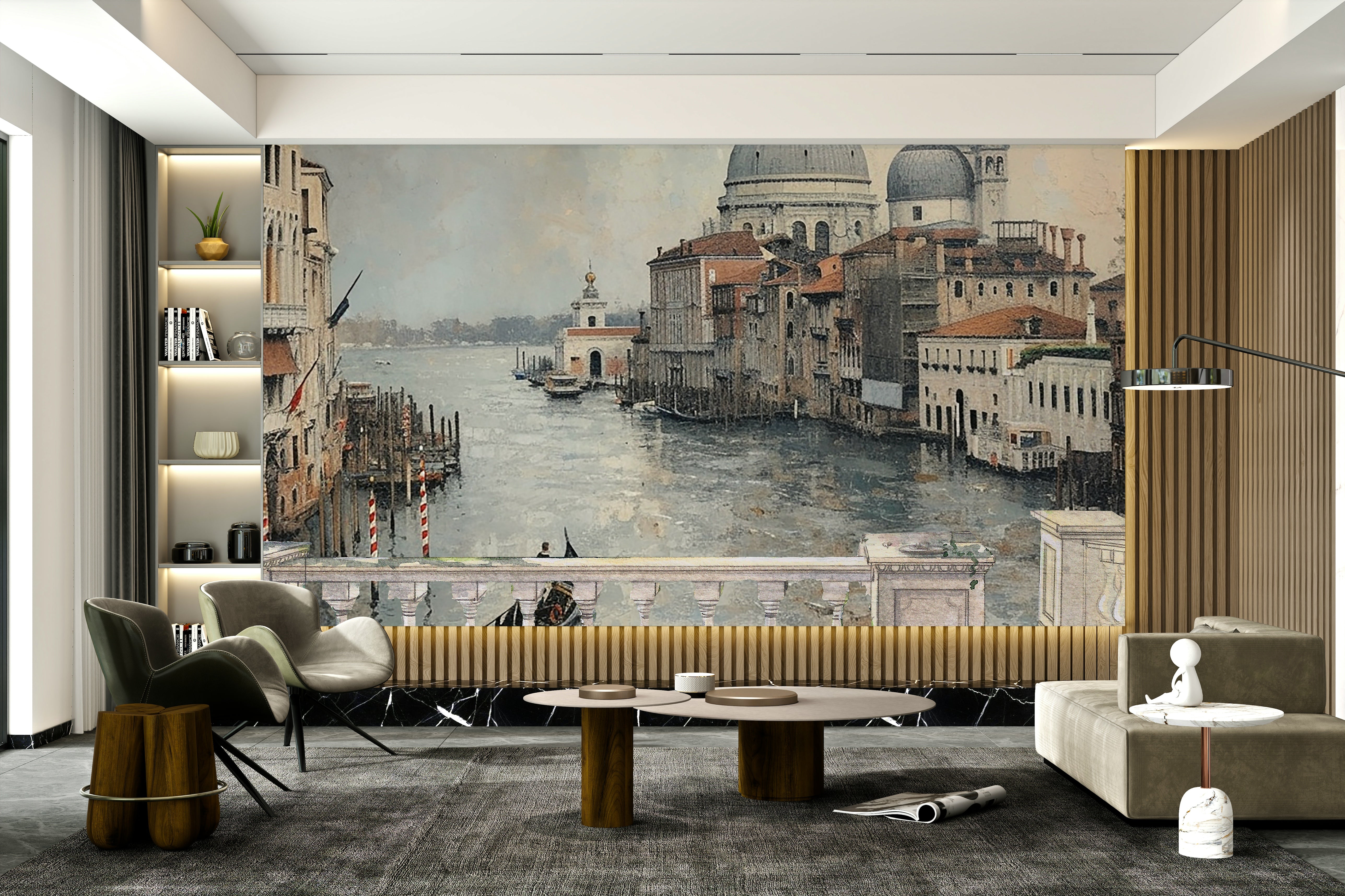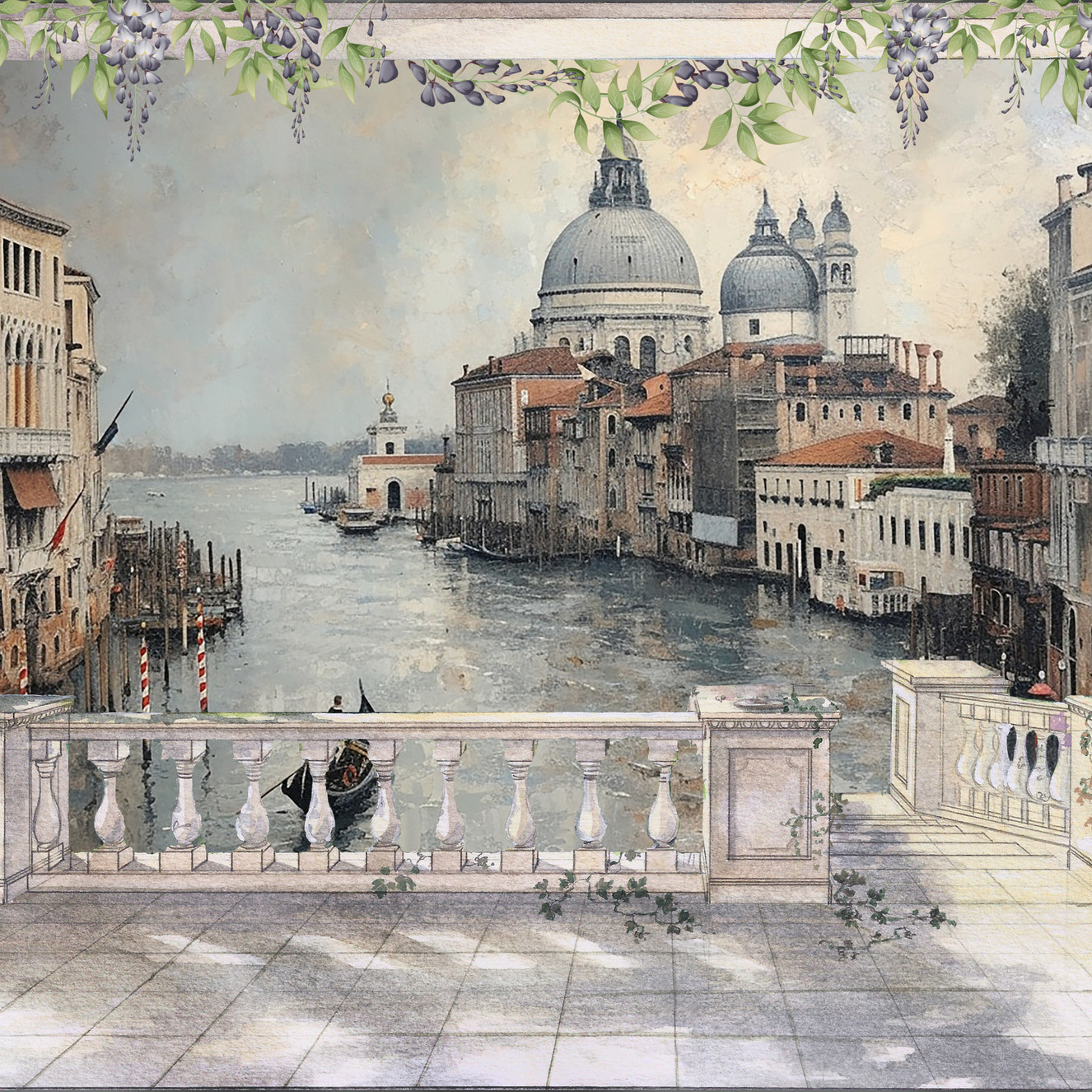 Bring the timeless elegance of Venice into your home with the Venetian Canal View Wallpaper Mural. This romantic scene showcases the Grand Canal’s iconic beauty—complete with domed architecture, historic buildings, and serene gondolas drifting past marble terraces. Soft vintage tones and artistic brushwork create an atmospheric feel, perfect for bedrooms, dining rooms, or classical living spaces. Accented with trailing wisteria and subtle textures, this mural adds depth and European charm to any wall. Whether you’re a travel lover or an art enthusiast, this mural turns your room into a breathtaking Venetian escape you’ll never tire of.