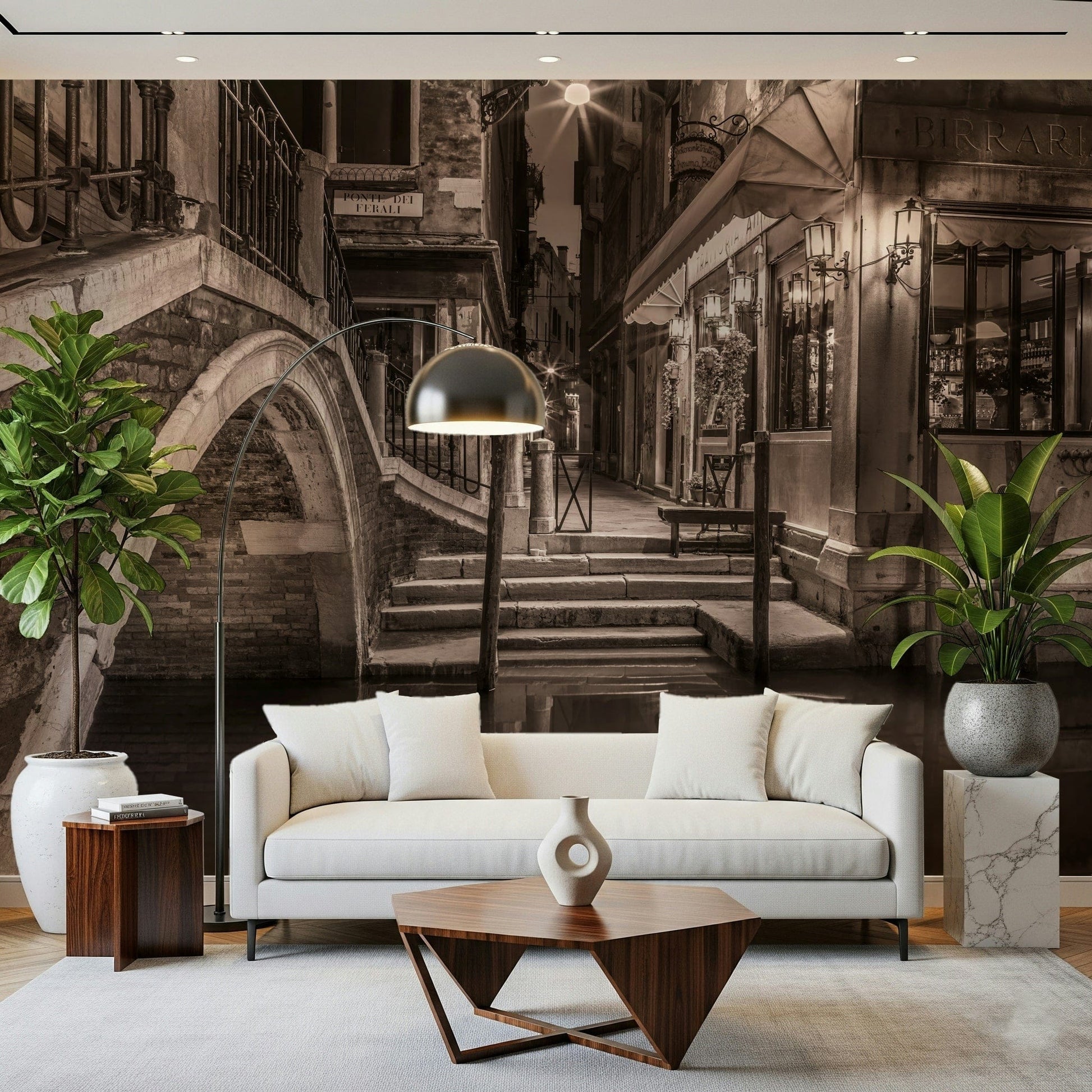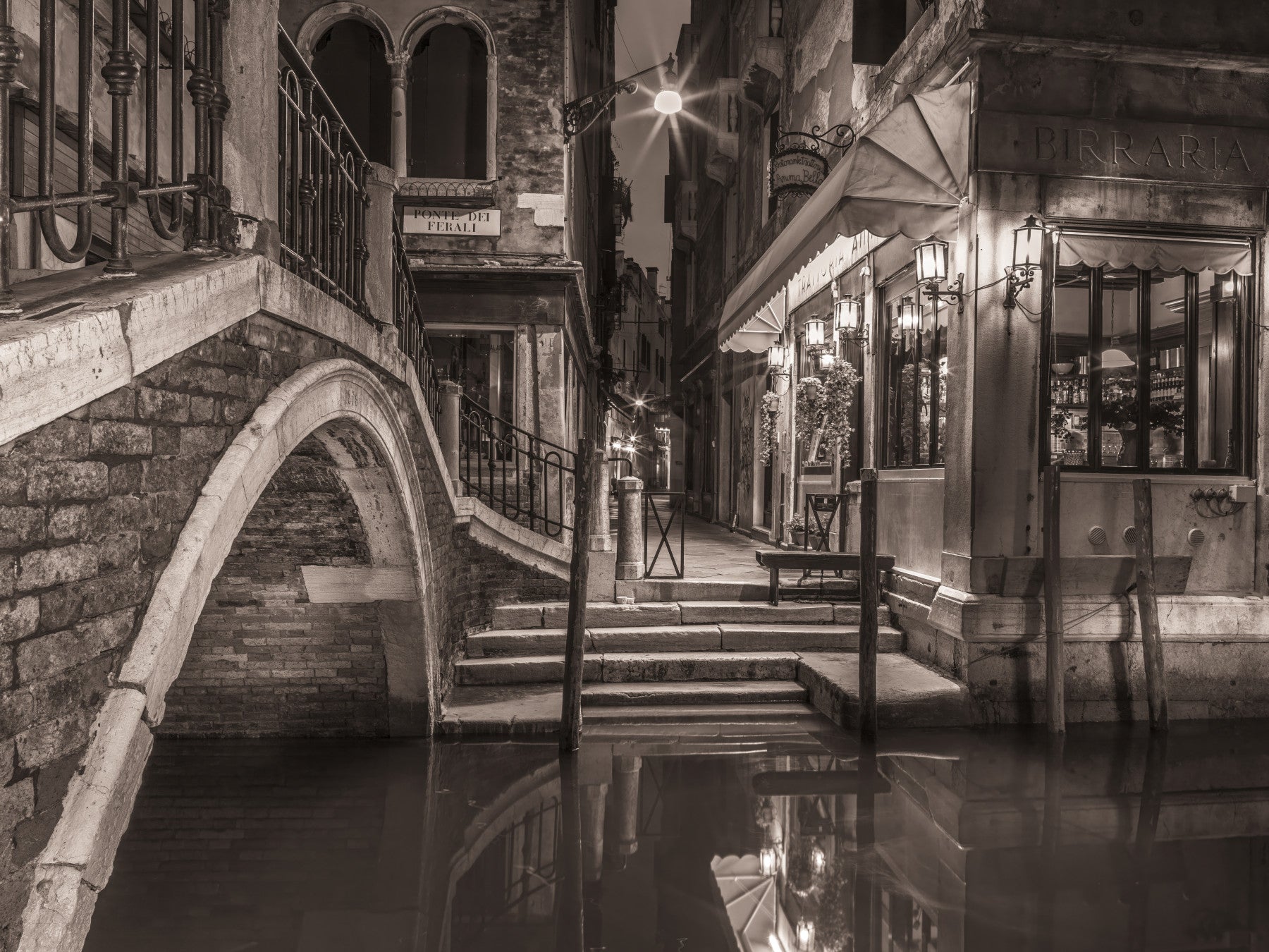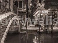 Night shot of cafe by narrow canal, Venice, Italy. Transform your living space with this striking Venetian canal scene. The muted sepia tones and detailed architectural elements offer a timeless elegance, perfect for creating a sophisticated atmosphere. This wallpaper for walls showcases a quiet canal at night, reflecting the soft glow of vintage lanterns. The intricate brickwork and wrought iron details bring depth and character to any room, making it ideal for a living room, dining area, or home office. This design adds a touch of European charm, blending seamlessly with both modern and classic décor.