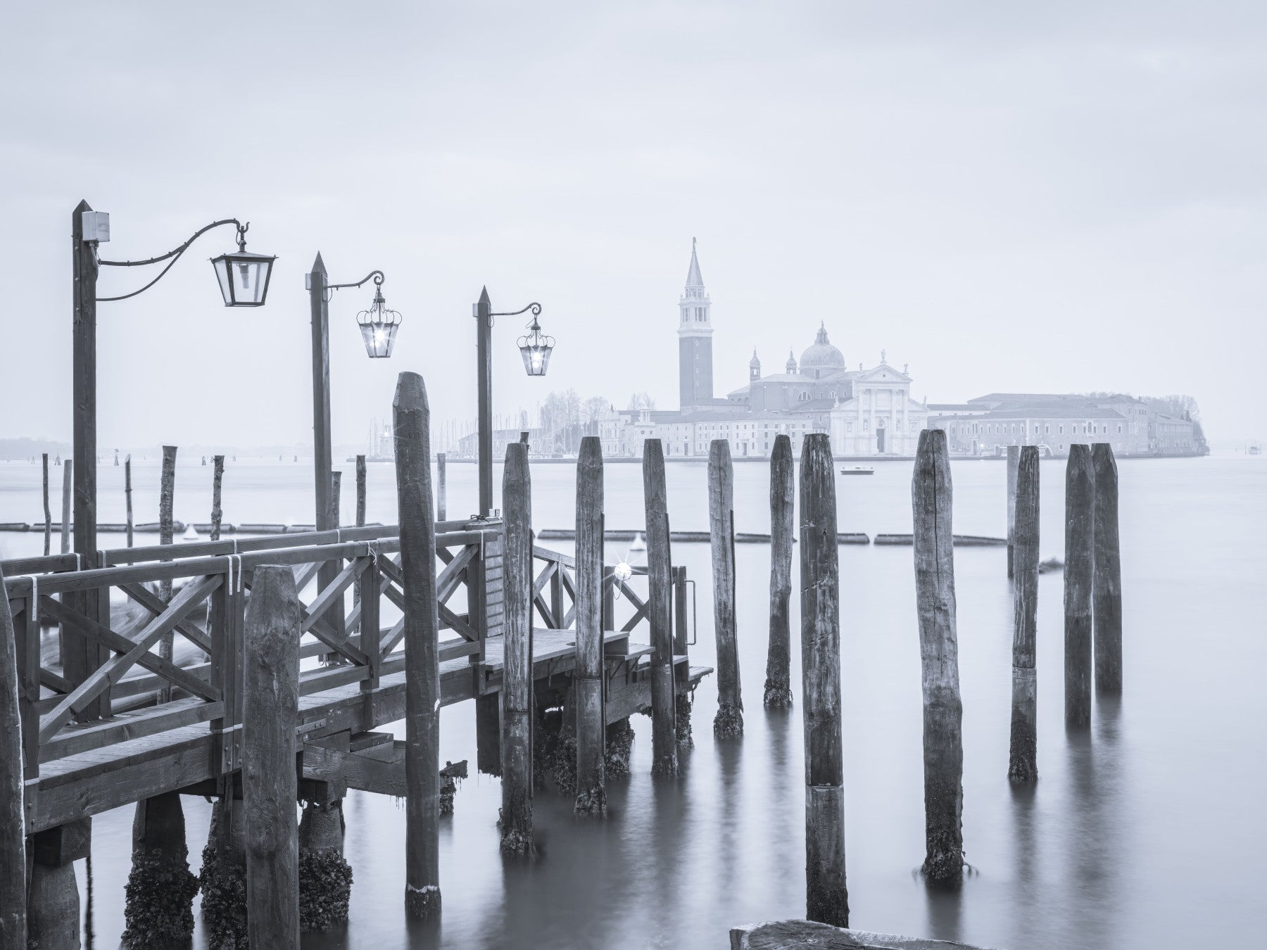Invite a sense of serenity into your space with this tranquil Venetian scene. This wallpaper for walls captures a quiet moment by the water, featuring a weathered wooden pier and distant architecture fading into a misty sky. Soft monochrome tones create a calming visual effect, ideal for bedrooms, living rooms, or studies. The subdued palette complements minimalist or Scandinavian interiors, lending an air of sophistication and peace to any room.