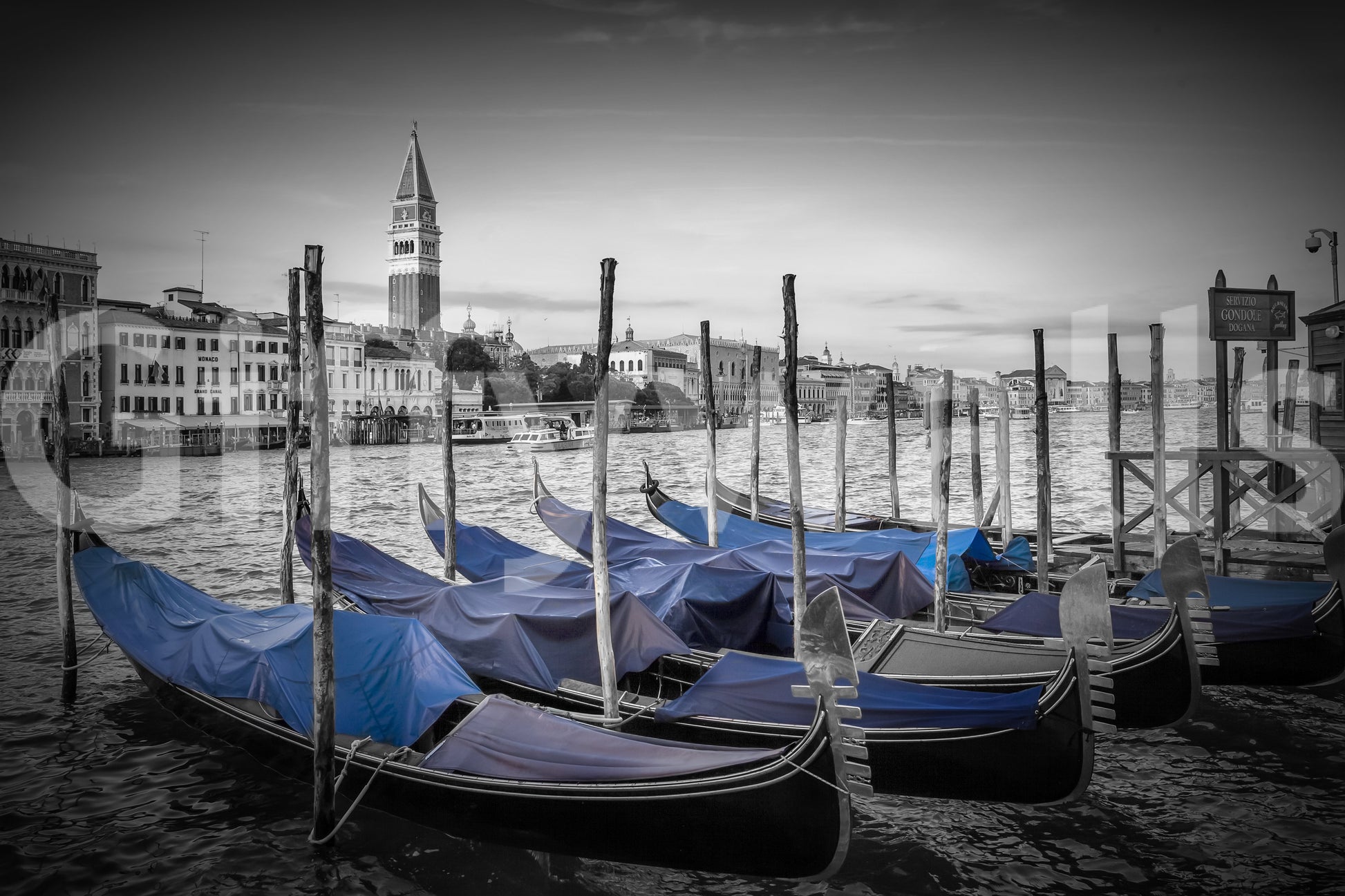 Step into a timeless scene of Venice, where the iconic St Mark's Campanile pierces the sky in the distance. This evocative wallpaper captures the essence of the Grand Canal, with a fleet of gondolas gently bobbing in the water, their blue covers adding a splash of colour to the otherwise muted palette. The weathered wooden posts stand as silent witnesses to the city's rich history and romantic allure. Immerse yourself in the serene atmosphere of this classic Venetian vista, a perfect reminder of the city's unique charm and enduring beauty.