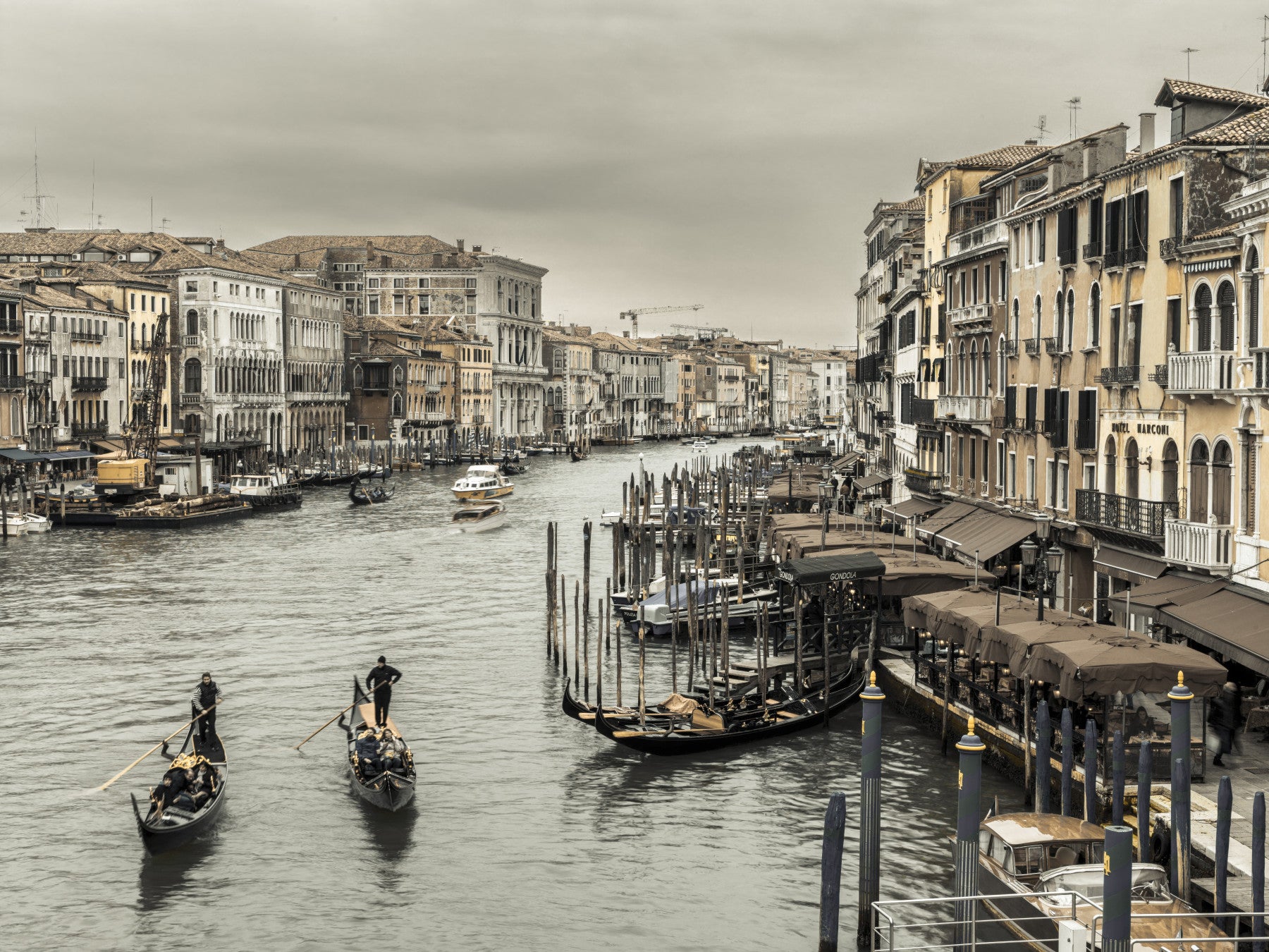 Adorn your home with the timeless charm of our Venice Grand Canal Wall Mural. This captivating mural wallpaper captures the iconic waterway of Venice, Italy, with its historic buildings in shades of beige and ochre lining the Grand Canal. Traditional gondolas glide along the water, alongside other boats, under an atmospheric, overcast sky. It's an ideal wallpaper for walls to introduce unique character and a profound sense of romantic European travel and serene cityscapes to any room. Its detailed architecture and tranquil waters offer a compelling backdrop, ensuring your home feels both cultured and beautifully connected to the unique ambiance of Venice