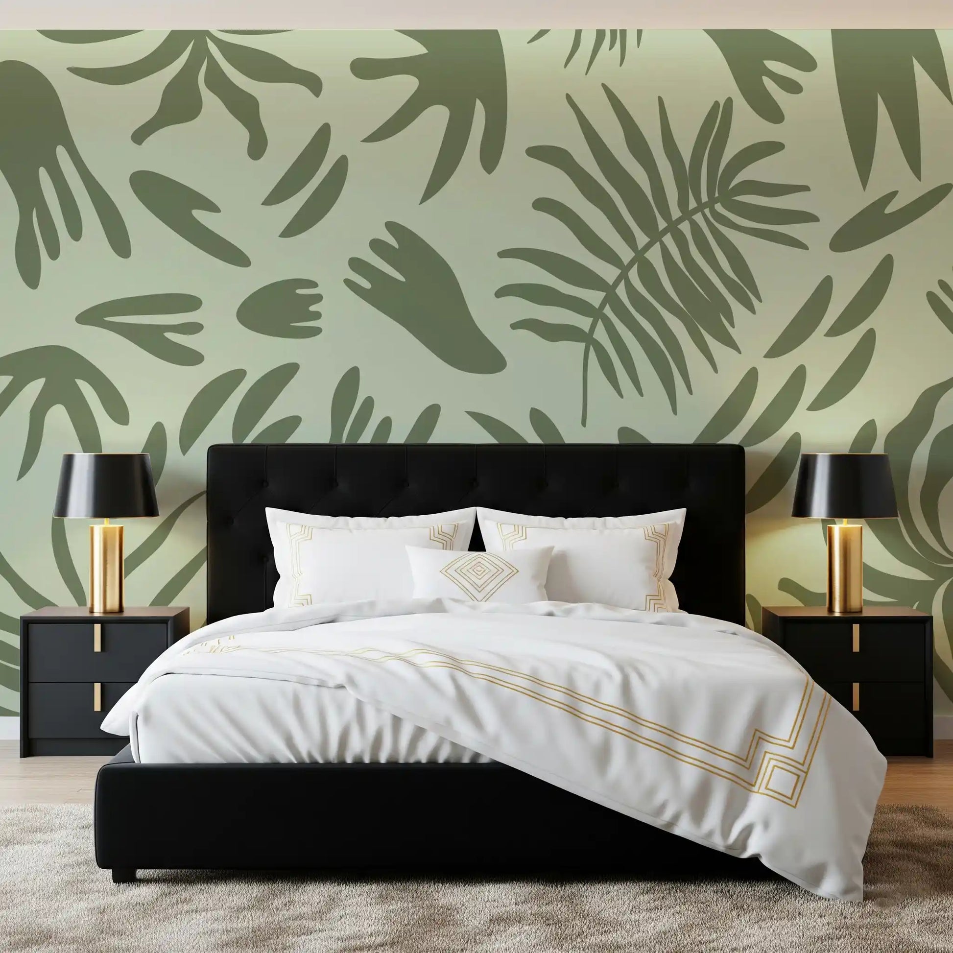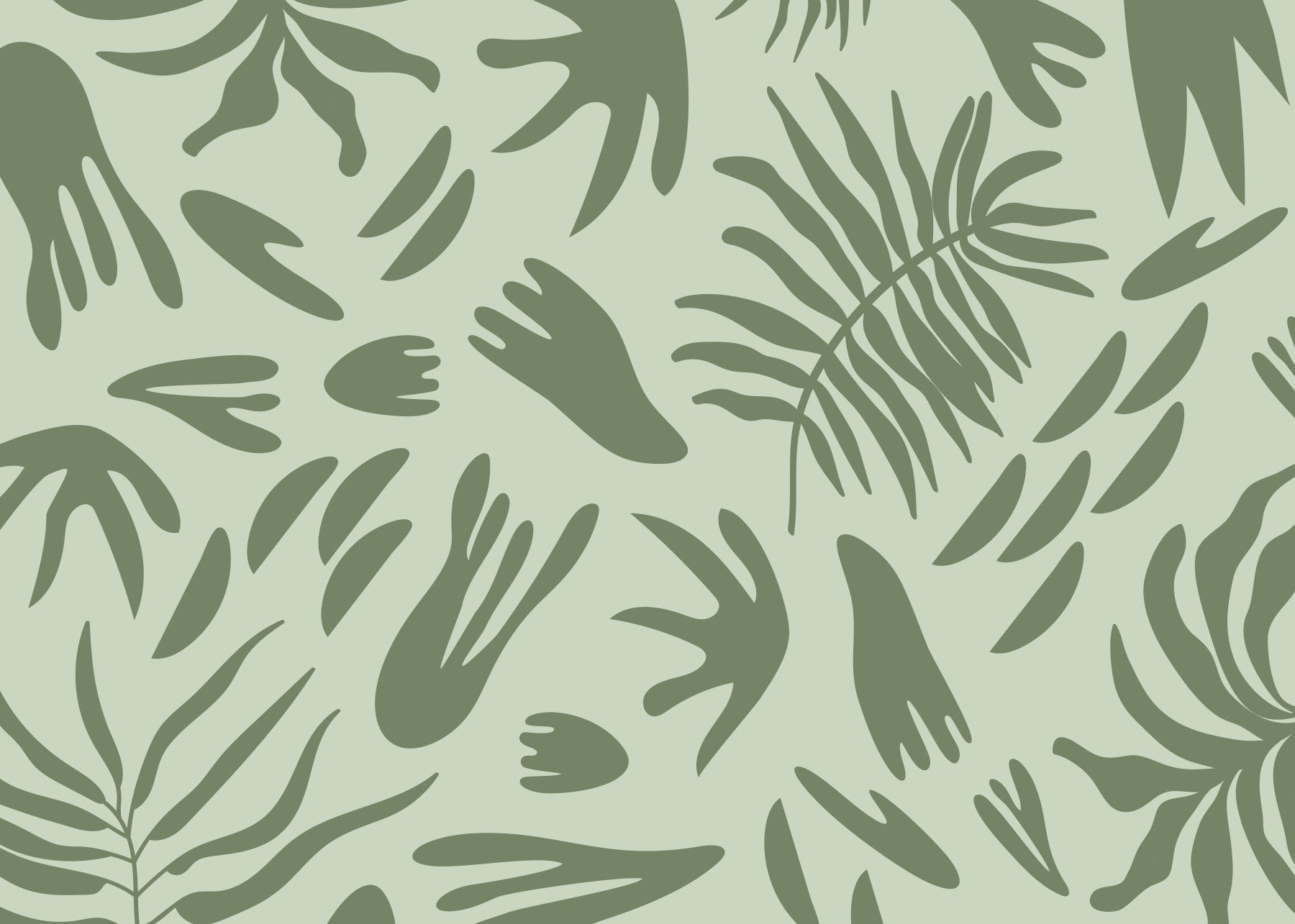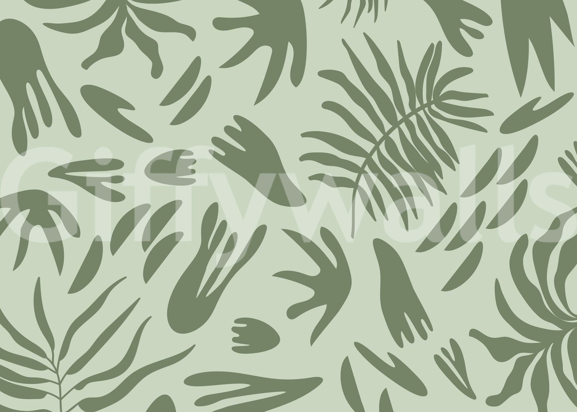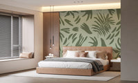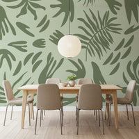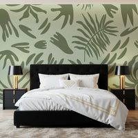 Transform your living space with this captivating abstract botanical wallpaper for walls. Its modern design features an array of stylised leaf and organic shapes, creating a fluid and continuous pattern across your surfaces. The serene colour palette showcases soft sage green as the backdrop, beautifully contrasted by deeper olive green forms. This sophisticated blend offers a calming and refreshing atmosphere, perfect for fostering tranquillity. Install this elegant pattern in bedrooms, living rooms, or home offices to cultivate a peaceful retreat. It complements minimalist and contemporary interiors, adding a touch of natural artistry without overwhelming the room. The clean lines and biophilic elements enhance any space with subtle visual interest and a sophisticated, organic feel.