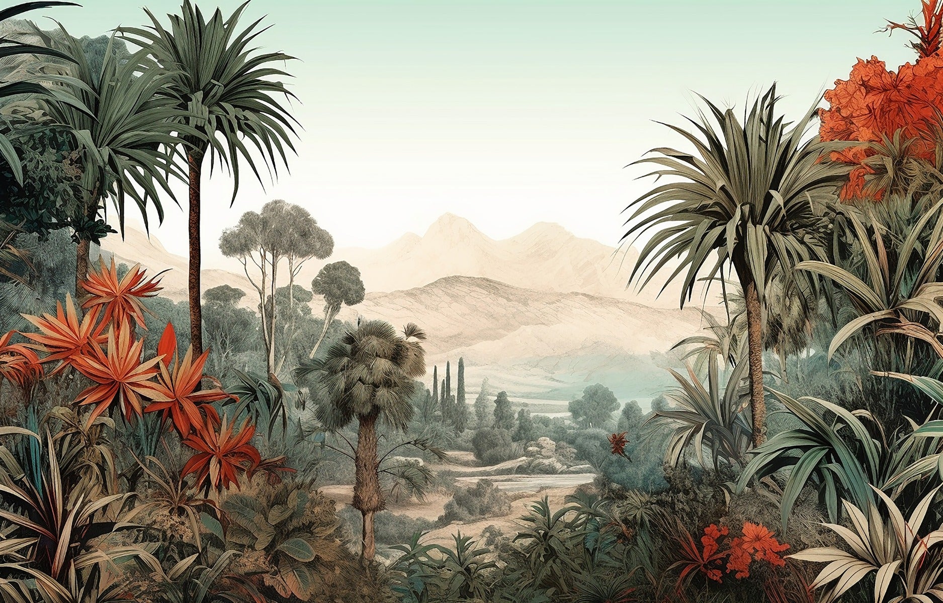Elevate your home with the Verdant Valley Vintage Tropical Flora Wallpaper Mural, where timeless elegance meets natural charm. Adorn your walls with this eco-conscious choice, crafted from sustainable materials, ensuring you not only beautify your space but also honor the environment. The lush imagery of verdant tropical palm trees offers a serene escape, making any room feel like an outdoor oasis. This nature wallpaper's vintage touch adds a layer of sophistication, seamlessly blending with various decor styles. Whether it's the focal point or a complementary backdrop, this vintage tropical wallpaper invites tranquility and aesthetic refinement into your living quarters.