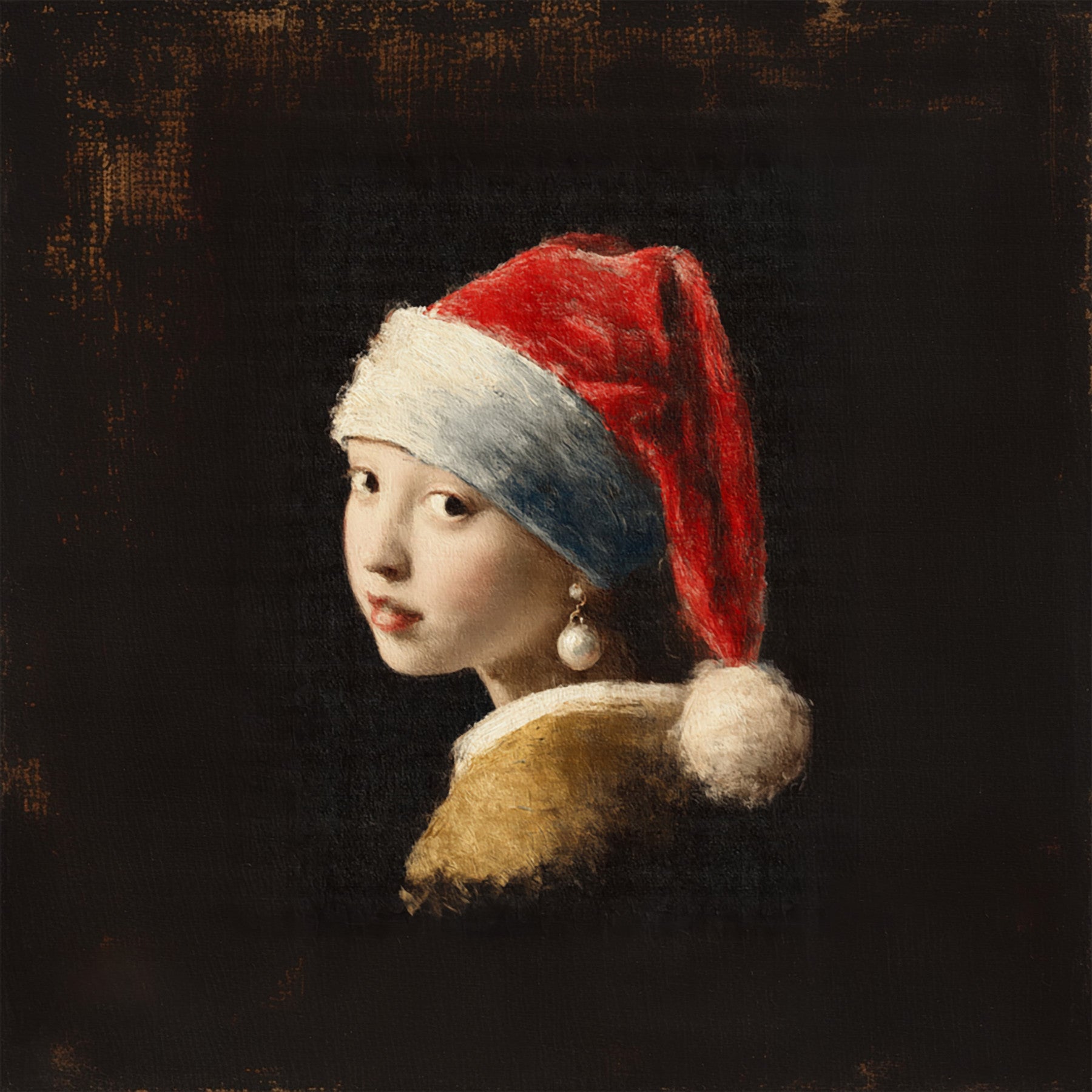 A playful reinterpretation of the classic girl with a pearl earring, transformed into a festive Christmas icon. Wearing a bright red Santa hat, her timeless elegance meets a whimsical holiday twist. The dark background enhances the contrast of her luminous skin, delicate pearl, and cheerful seasonal details. Perfect for bringing humor, charm, and a touch of art history into winter interiors. This design combines festive spirit with a wink to the Old Masters, making it a unique wall piece for holiday celebrations.