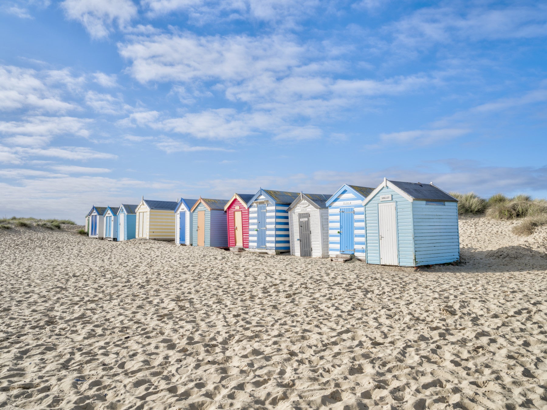 A detail shot of the colorful sheds and the sand texture.