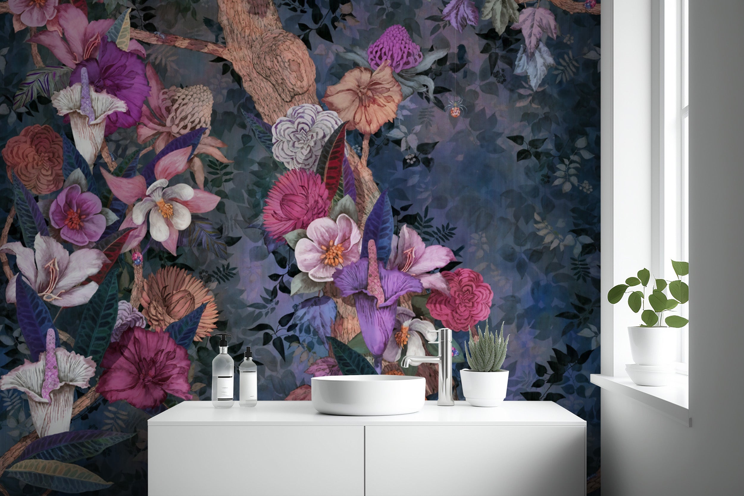 Experience the beauty of nature with our vibrant floral mural wallpaper. This flower wallpaper showcases a stunning array of blossoms in mesmerizing shades of purple. Ideal for accentuating any room, this purple color wallpaper offers a captivating and elegant touch to walls. Bring the charm of the outdoors inside with this timeless design.