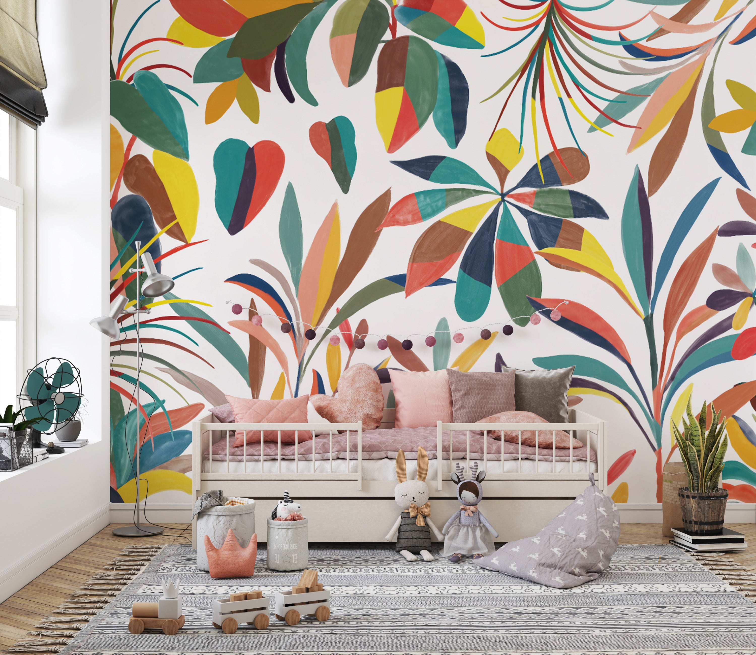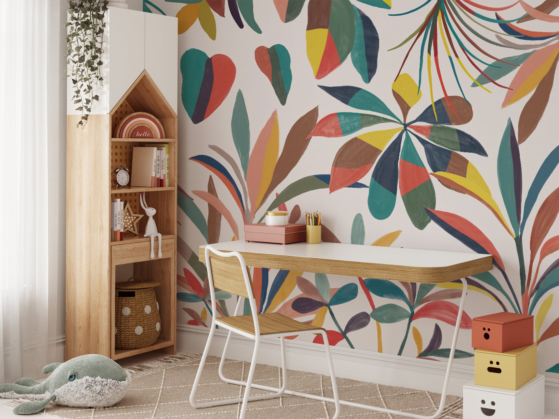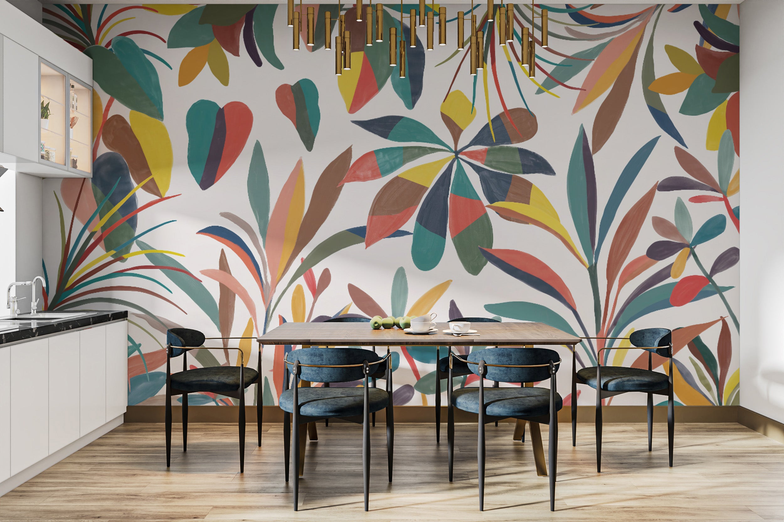 Colorful botanical wall mural with artistic foliage