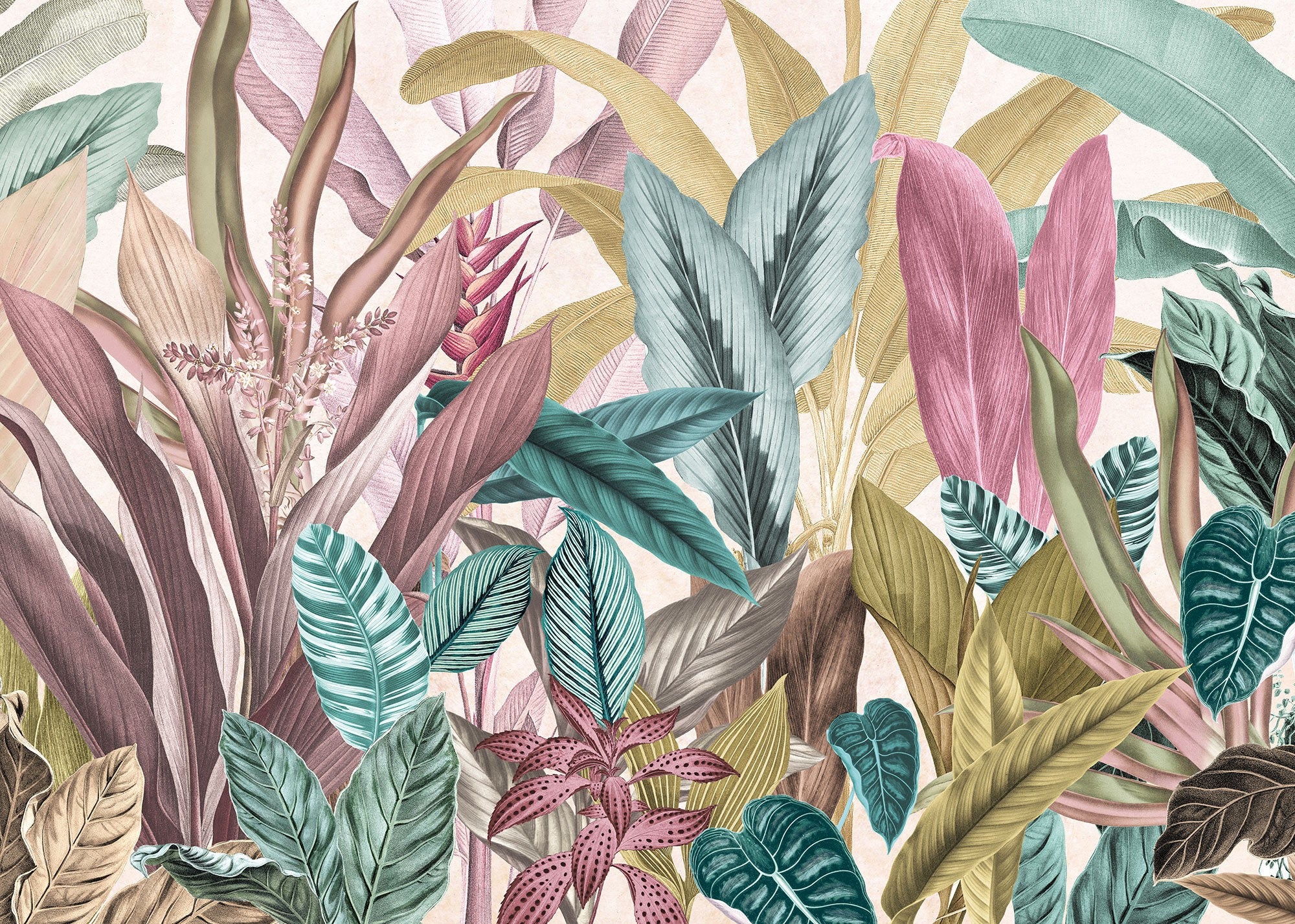 Add energy to your room with vibrant tropical leaf wallpaper. Featuring bold colors and detailed foliage, this tropical leaf wallpaper brings nature indoors with a lively touch. The rich greens, teals, and pinks create a dynamic botanical mural perfect for modern spaces. This colorful tropical wallpaper offers a striking statement, whether for a living room, bedroom, or office. The bold leaf pattern wallpaper adds depth and texture, while the detailed hand-drawn design complements contemporary interiors. This modern botanical wall covering combines natural beauty with vibrant hues, creating a fresh, inviting atmosphere for any space.