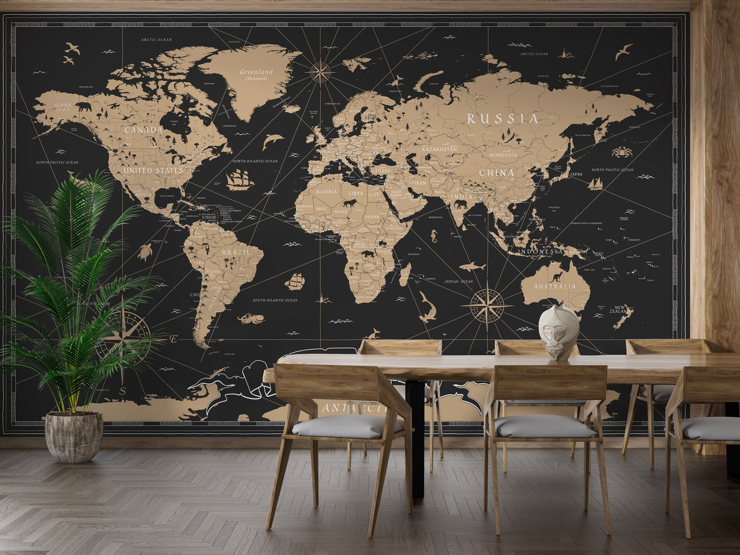 Vintage Black Golden World Map Wallpaper Murals - Giffywalls