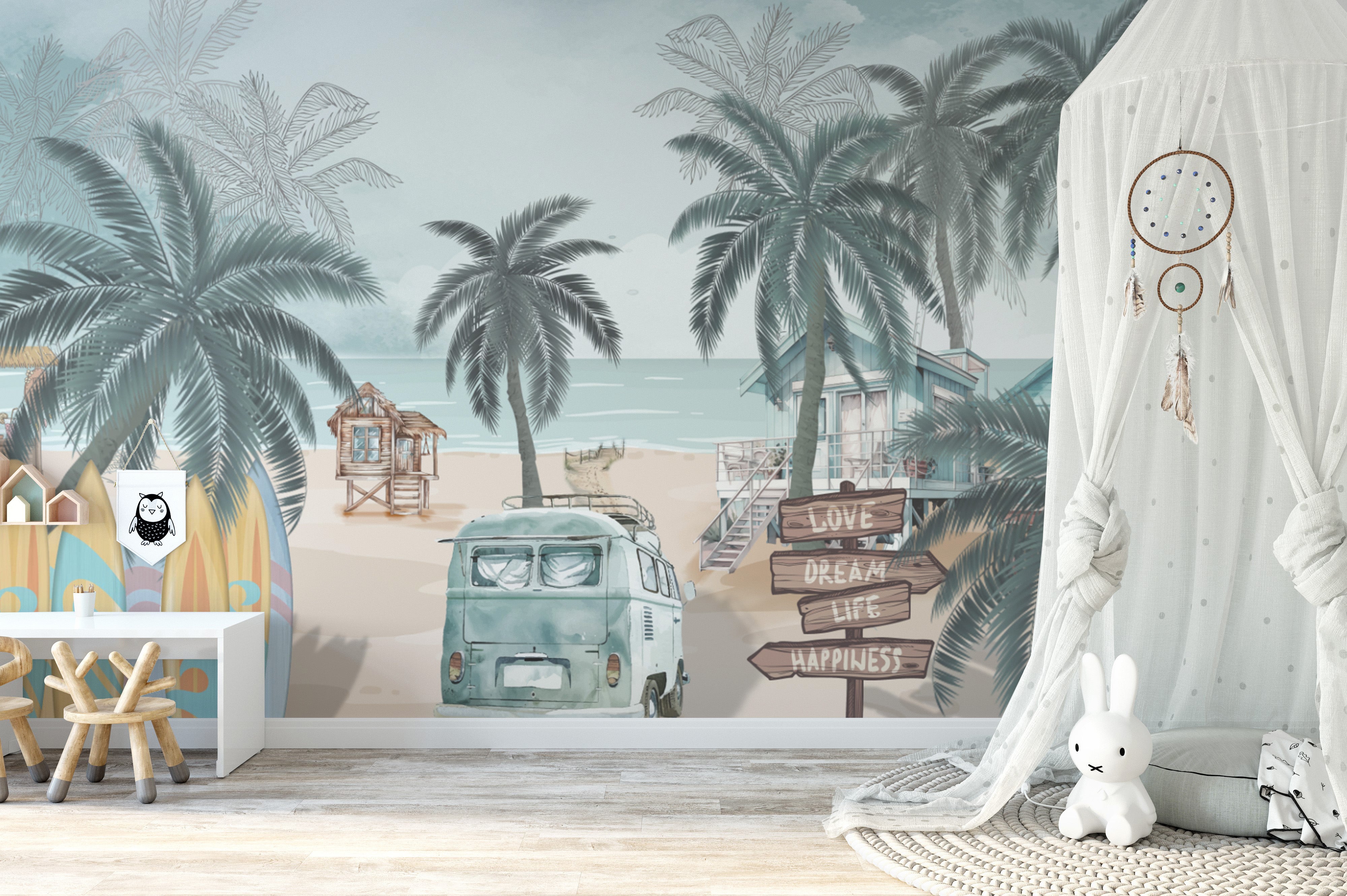 The Vintage Coastal Beach Wallpaper brings a relaxing seaside vibe with hand-drawn palm trees, a retro van, and surfboards resting on soft sand. The pastel blues and sandy beige tones capture the charm of a tropical beach wallpaper, making it perfect for coastal-inspired spaces. A wooden signpost adds a nostalgic touch, enhancing the warmth of a beach house wallpaper for walls. Gentle waves meet the horizon, creating the feeling of a peaceful getaway. This boho beach wall mural blends vintage aesthetics with a carefree summer lifestyle, offering a refreshing coastal look filled with soft ocean breezes and endless adventure.