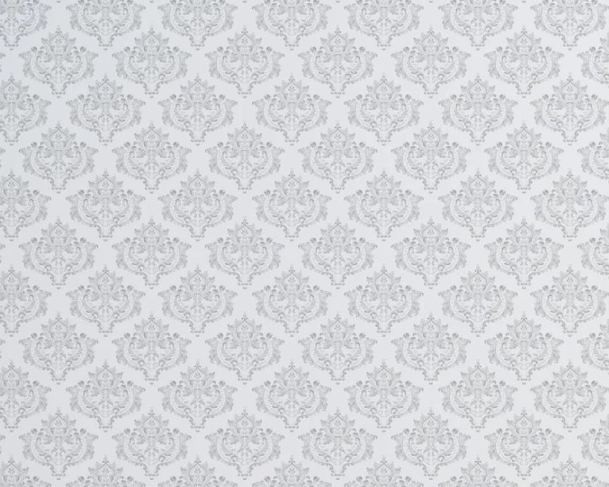 Sophisticated damask repeat wallpaper in grey and white tones.