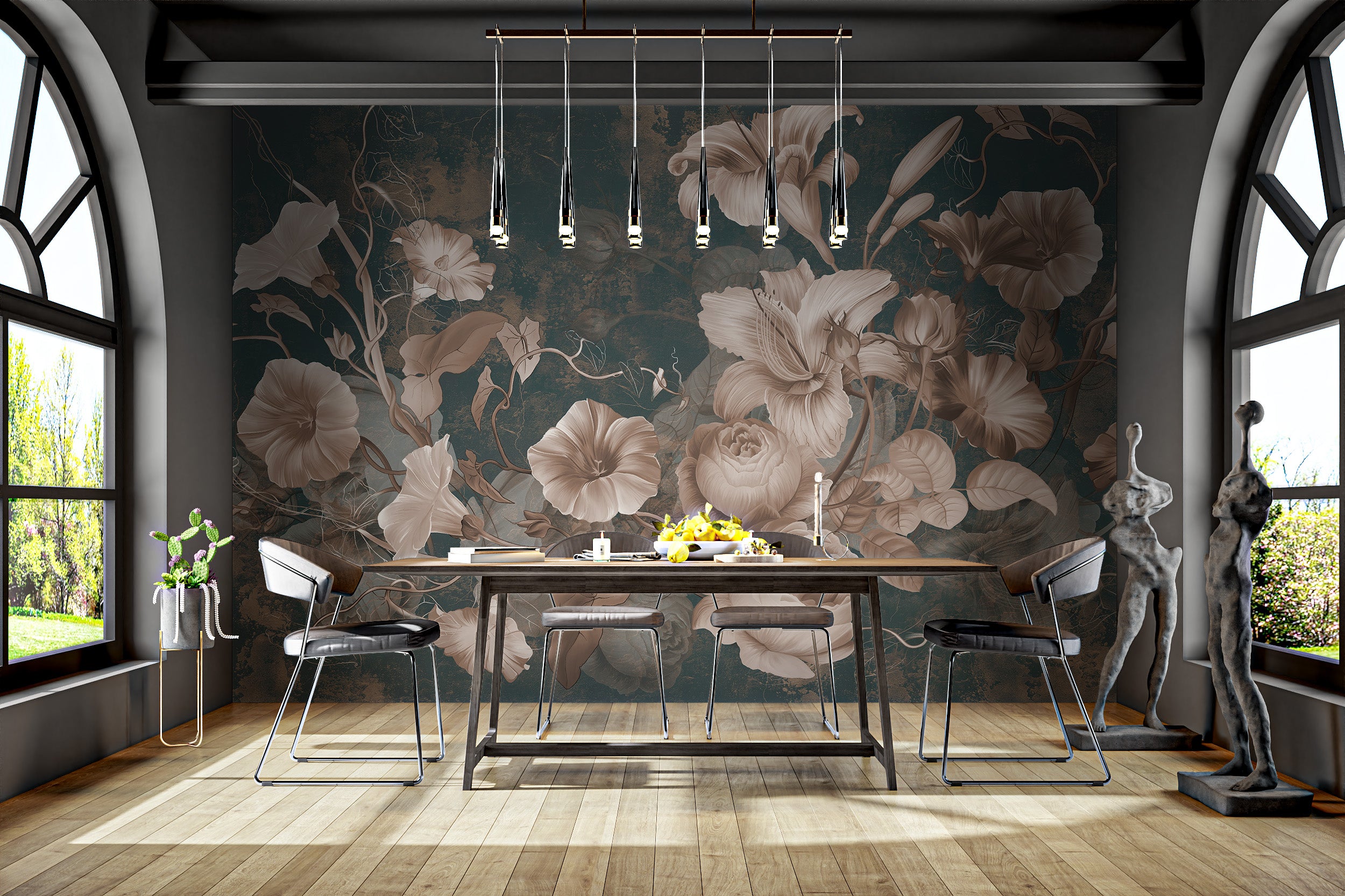 The vintage dark botanical floral mural is a masterpiece of timeless elegance. This luxury botanical mural brings a sophisticated charm to any interior, featuring antique flower wallpaper with intricate lilies, roses, and morning glories intertwined with delicate vines. The dark botanical mural blends earthy tones with a textured background, perfect for creating a dark academic aesthetic wallpaper. Ideal for bedrooms, living rooms, or accent walls, this classic floral pattern adds warmth and depth to your décor. Elevate your home with this artistic floral mural for those who appreciate vintage beauty and nature-inspired design.
